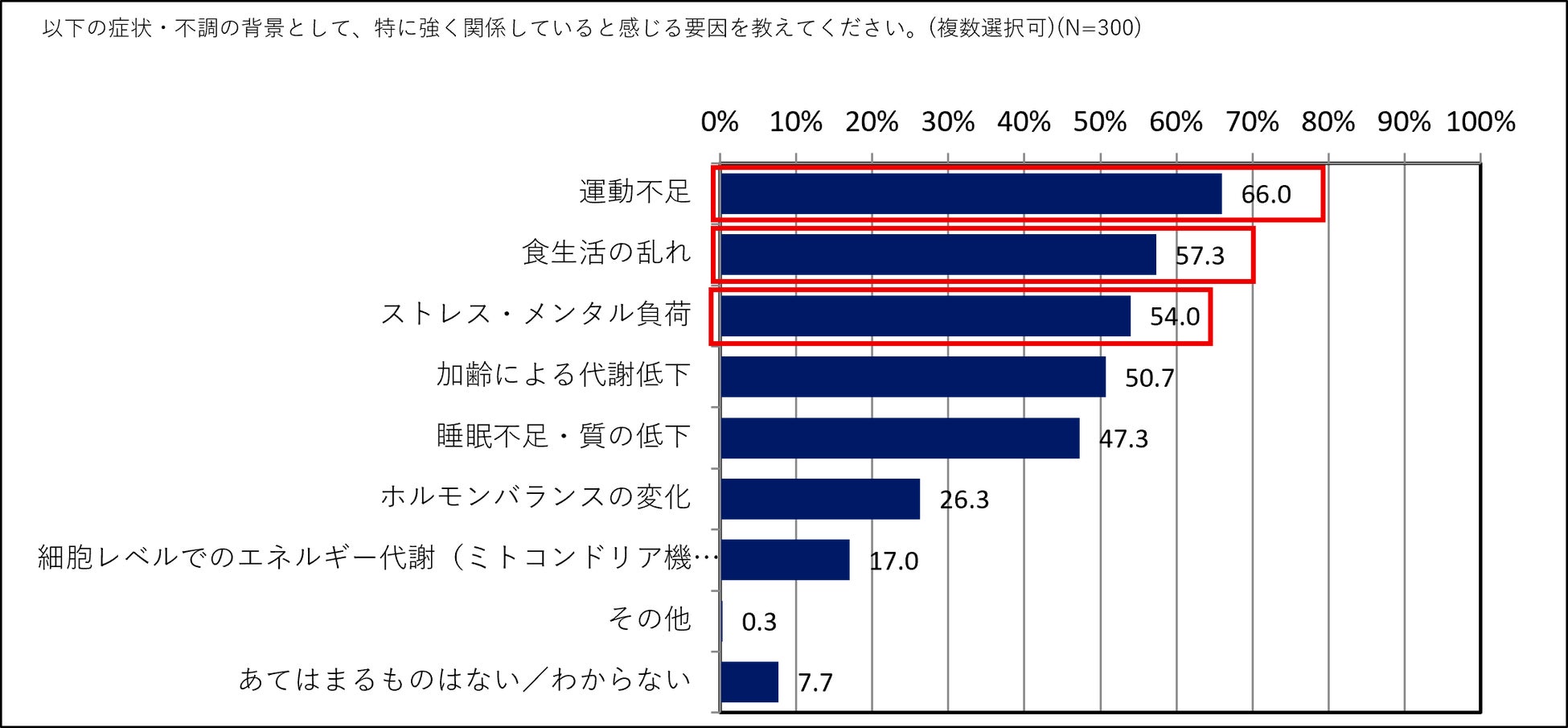 • 「脂肪燃焼力の低下」「抗疲労力の低下」に強く関係している要因の1位は「運動不足」が66.0%、2位「食生活の乱れ」が57.3%
