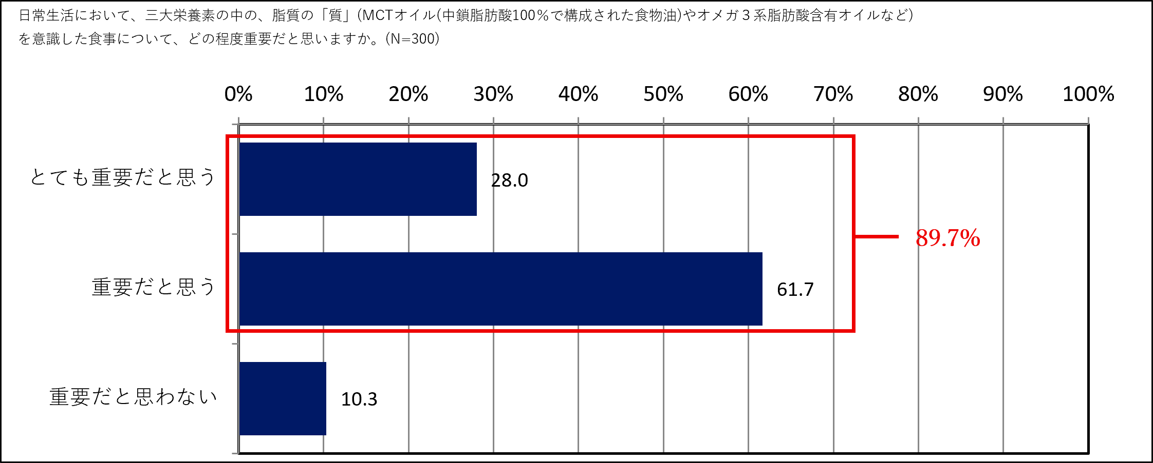 日常生活において、三大栄養素の中の、脂質の「質」(MCTオイル(中鎖脂肪酸100%で構成された食用油)やオメガ3系脂肪酸含有オイルなど)を意識した食事について、どの程度重要だと思うか質問したところ、89.7%の医師が重要だと思うと回答した。