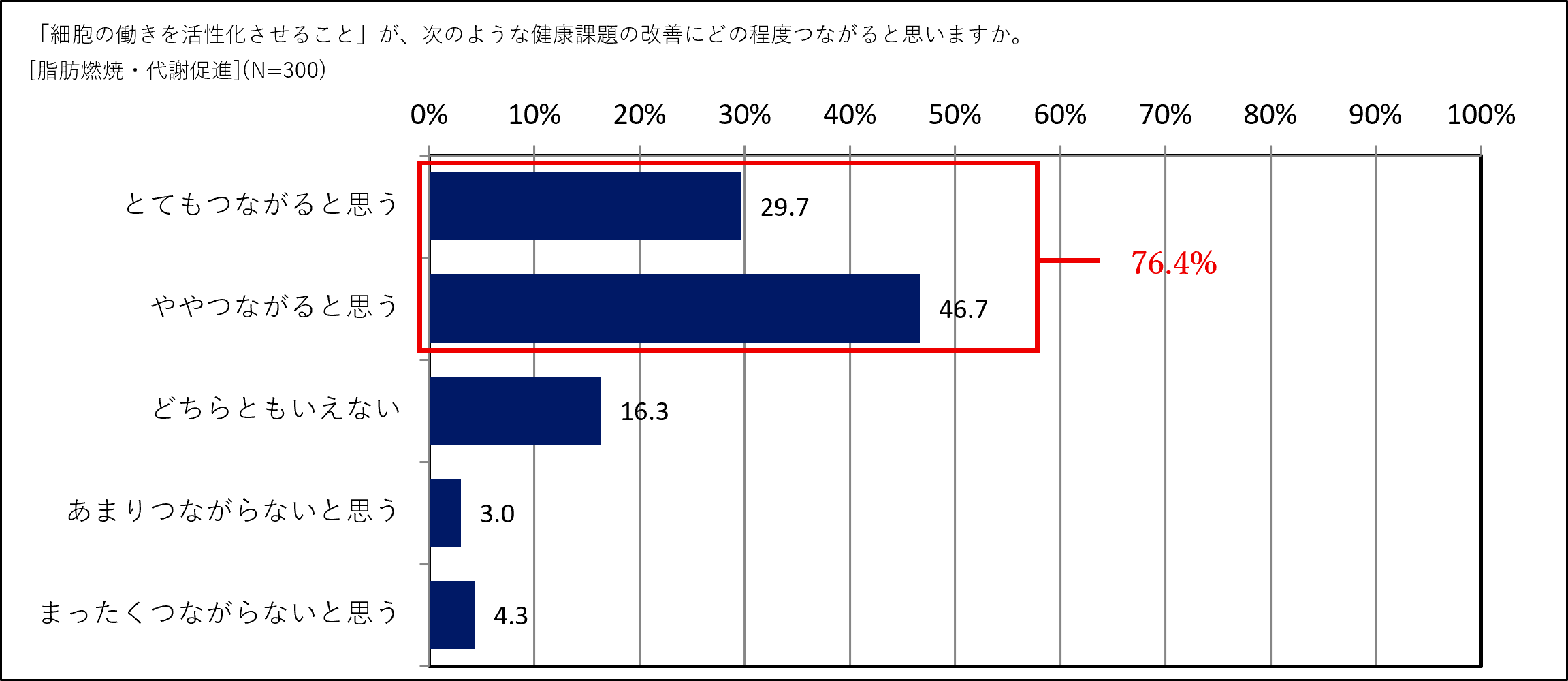 「細胞の働きを活性化させること」が、健康課題の改善にどの程度繋がると思うか医師に質問したところ、「脂肪燃焼・代謝促進」については76.4%、「慢性疲労・倦怠感」については69.3%の医師が改善に繋がると思うと回答。「細胞の働きを活性化させること」が健康課題の改善において深く関与していることがうかがえる。