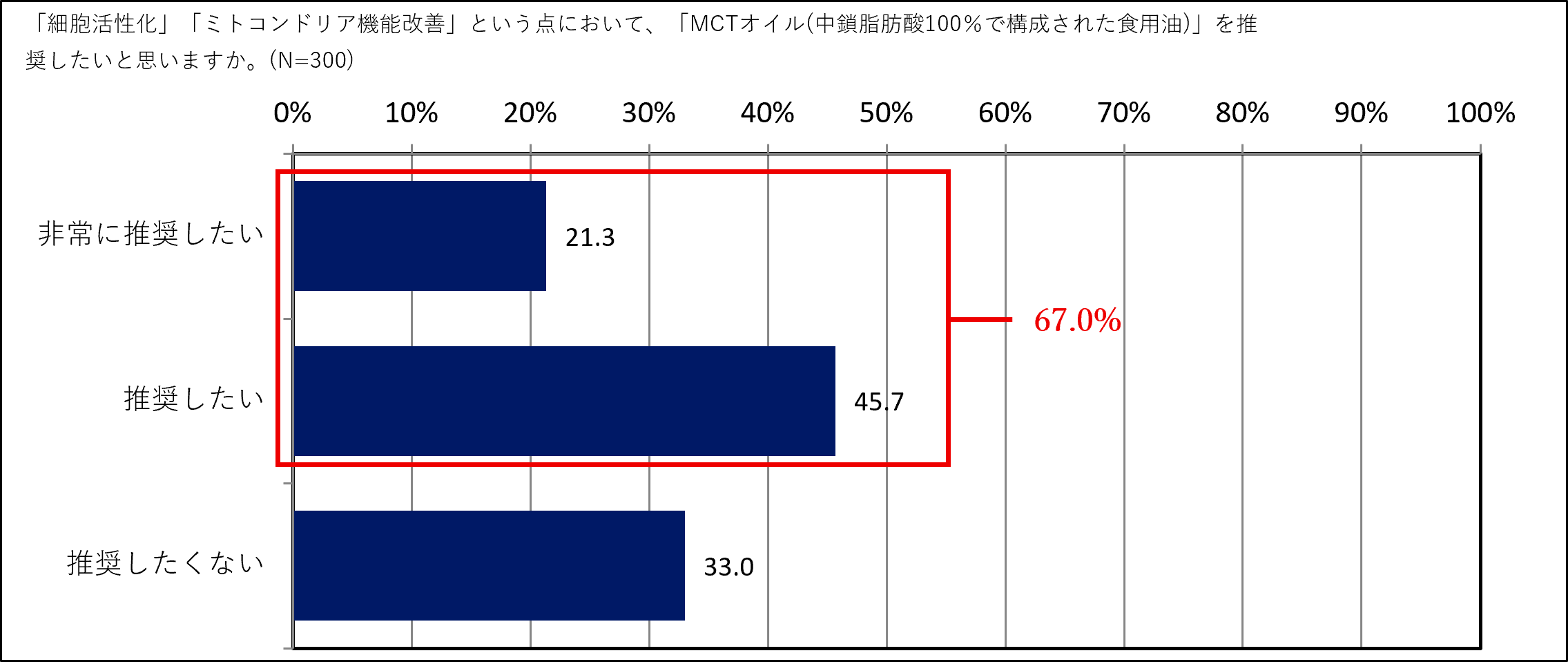 「細胞活性化」「ミトコンドリア機能改善」という点において、「MCTオイル(中鎖脂肪酸100%で構成された食用油)」を推奨したいと思うか質問したところ、67.0%の医師が「MCTオイル」を推奨したいと回答した。