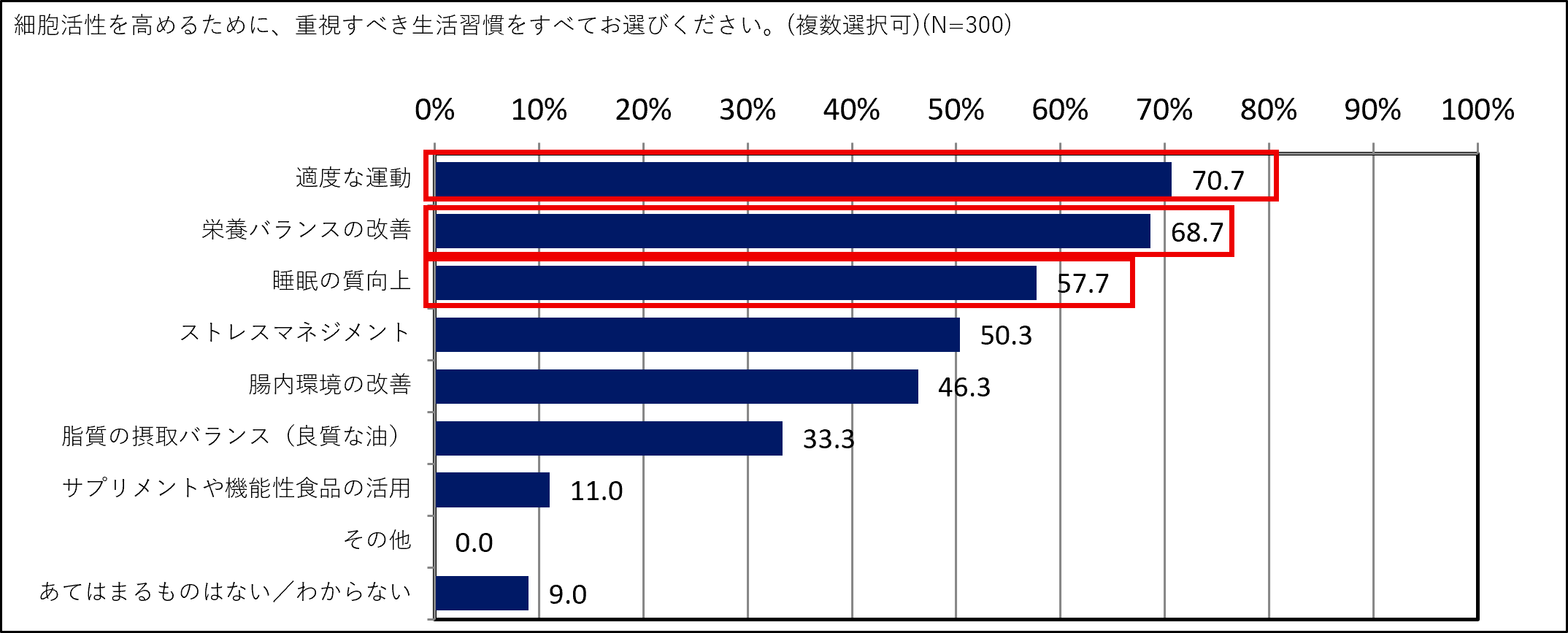 細胞活性を高めるために、重視すべき生活習慣について医師に質問したところ、1位「適度な運動」で70.7%、2位「栄養バランスの改善」で68.7%、3位は「睡眠の質向上」で57.7%という結果となった。