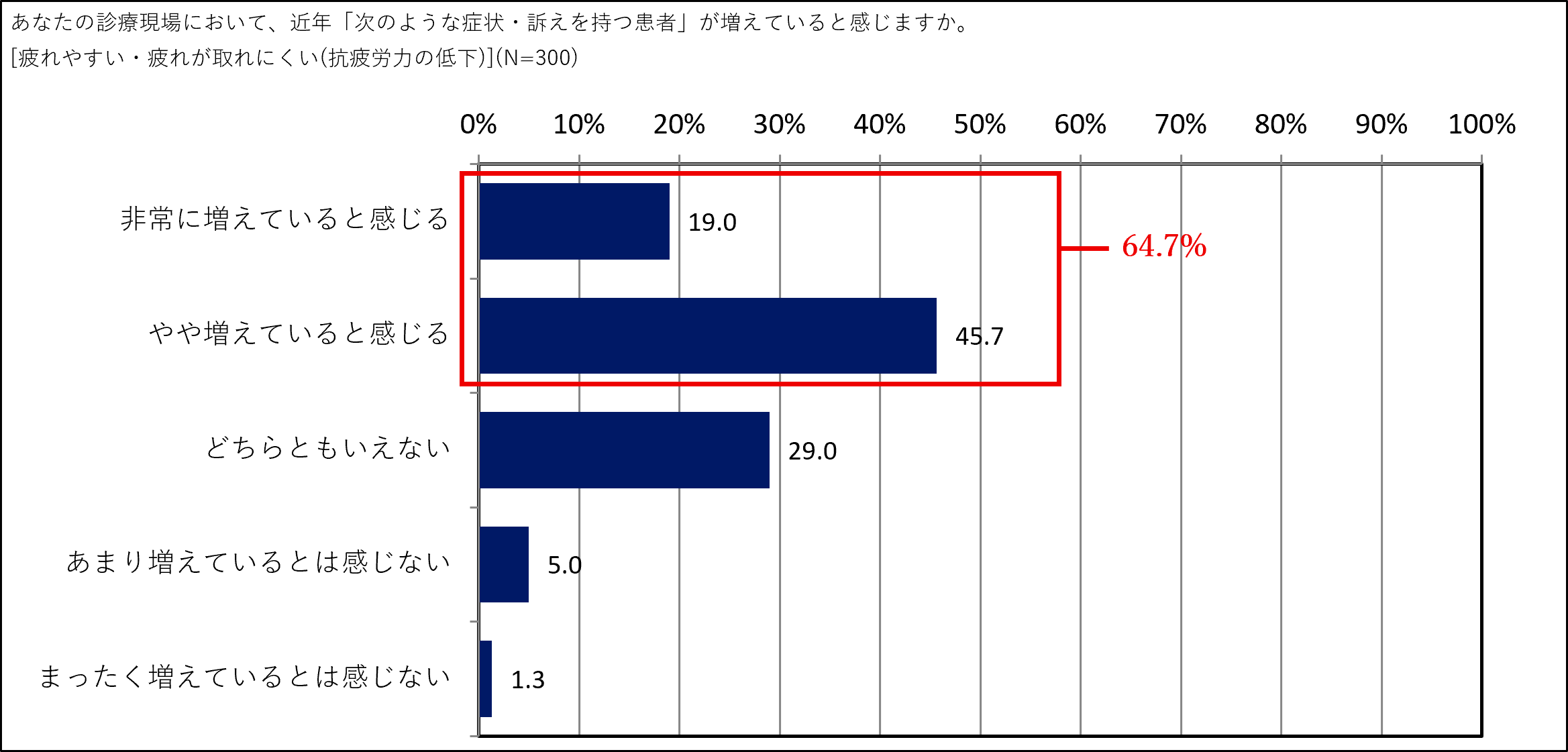 • 診療現場において、「太りやすい・痩せにくい(脂肪燃焼力の低下)」患者の増加を感じる医師が62.4%、「疲れやすい・疲れが取れにくい(抗疲労力の低下)」患者の増加を感じる医師が64.7%