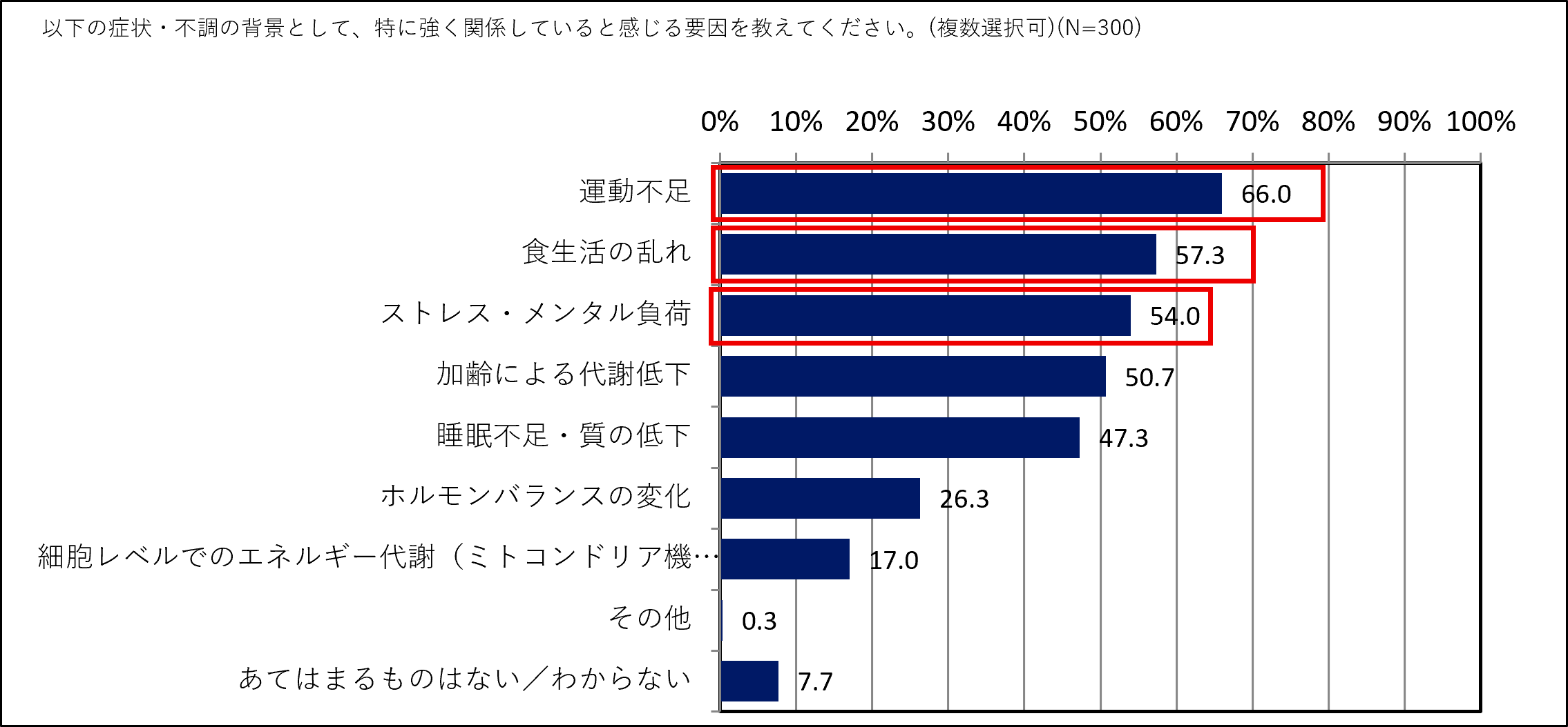 • 「脂肪燃焼力の低下」「抗疲労力の低下」に強く関係している要因の1位は「運動不足」が66.0%、2位「食生活の乱れ」が57.3%