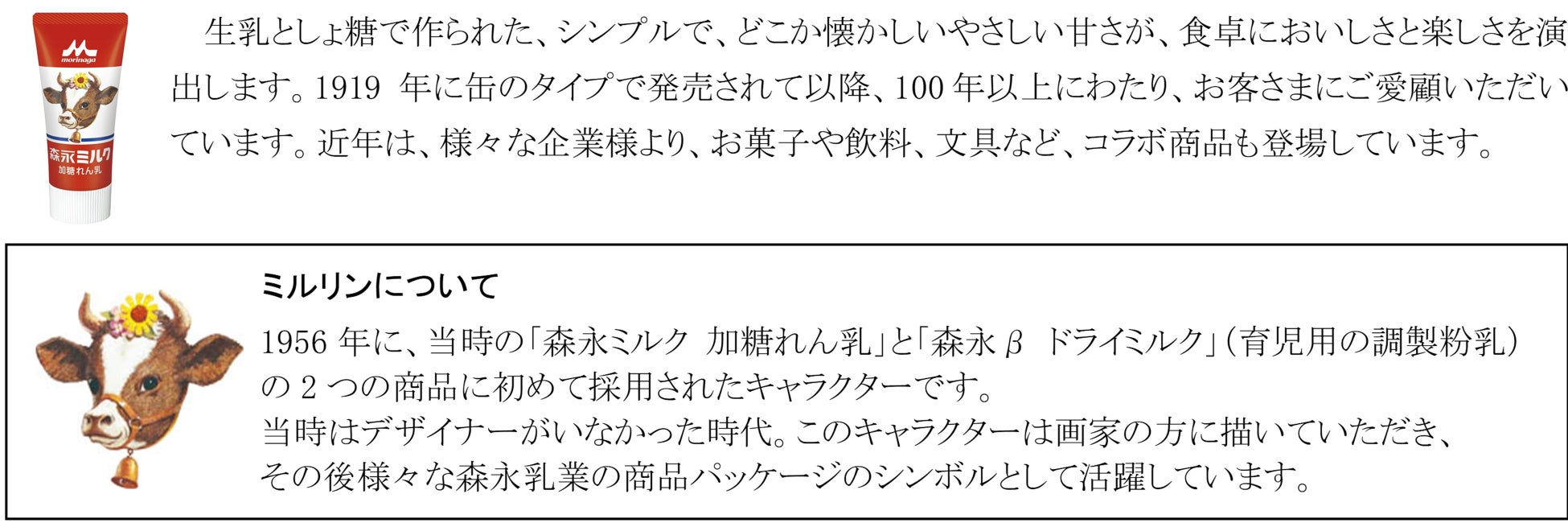 ② パッケージは「森永ミルク 加糖れん乳」の鮮やかな赤色を基調とし、キャラクター“ミルリン”を採用することで、懐かしくほっとするデザインに仕上げました。