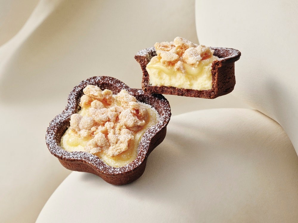北海道産マスカルポーネチーズムースに、やさしい甘さのミルクソースを重ねたミルク感たっぷりな味わいのチーズタルトです。ココアとアーモンドパウダーを練り込んだザクっと香ばしいタルトカップが、心地よい食感のアクセントに。仕上げにサクサクのクランブルをトッピングしました。奥深い味わいと食感のコントラストをお楽しみください。