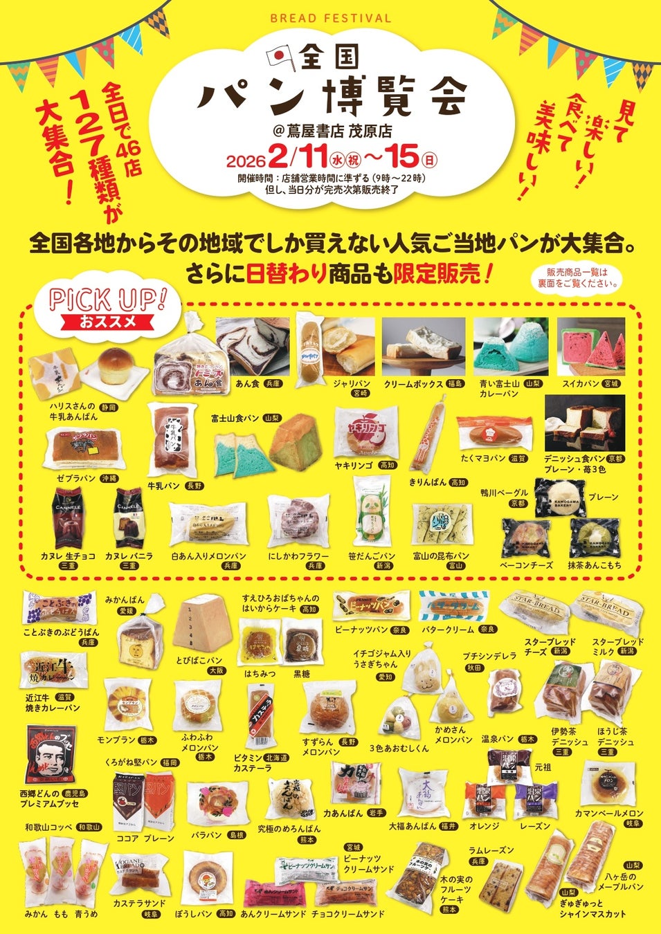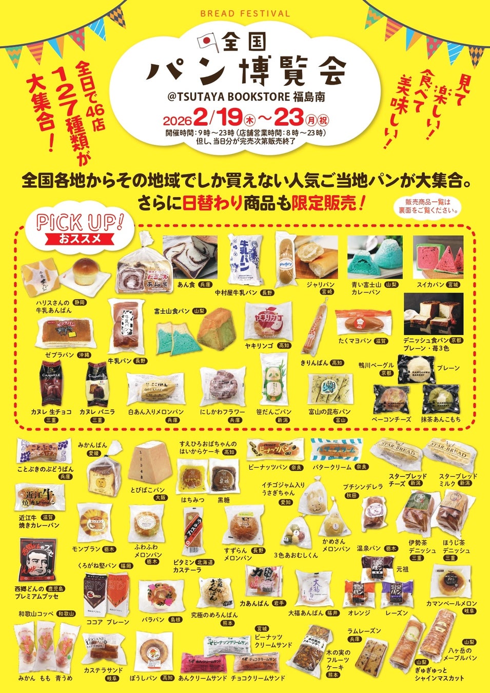 カルチュア・エクスペリエンス株式会社(本社:東京都千代田区、代表取締役社長:鎌浦 慎一郎)は、全国のご当地パンを集めたイベント『全国パン博覧会』を各地で開催しています。2026年2月は、「TSUTAYA 桑野店」(福島県郡山市)、「フタバ図書 TSUTAYA TERA イオンモール福岡店」(福岡県糟屋郡)、「蔦屋書店 茂原店」(千葉県茂原市)、「TSUTAYA BOOK STORE AIZU」(福島県会津若松市)、「TSUTAYA BOOK STORE 福島南」(福島県福島市)、「TSUTAYA 宇都宮南店」(栃木県宇都宮市)で、2月4日(水)より順次開催いたします。