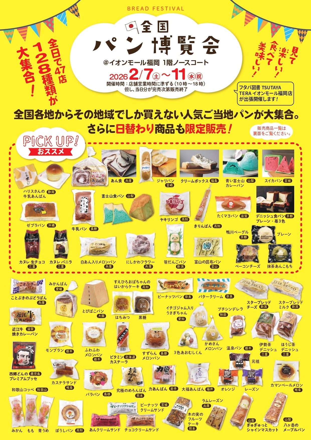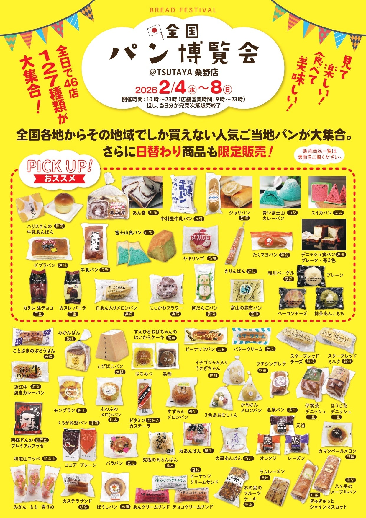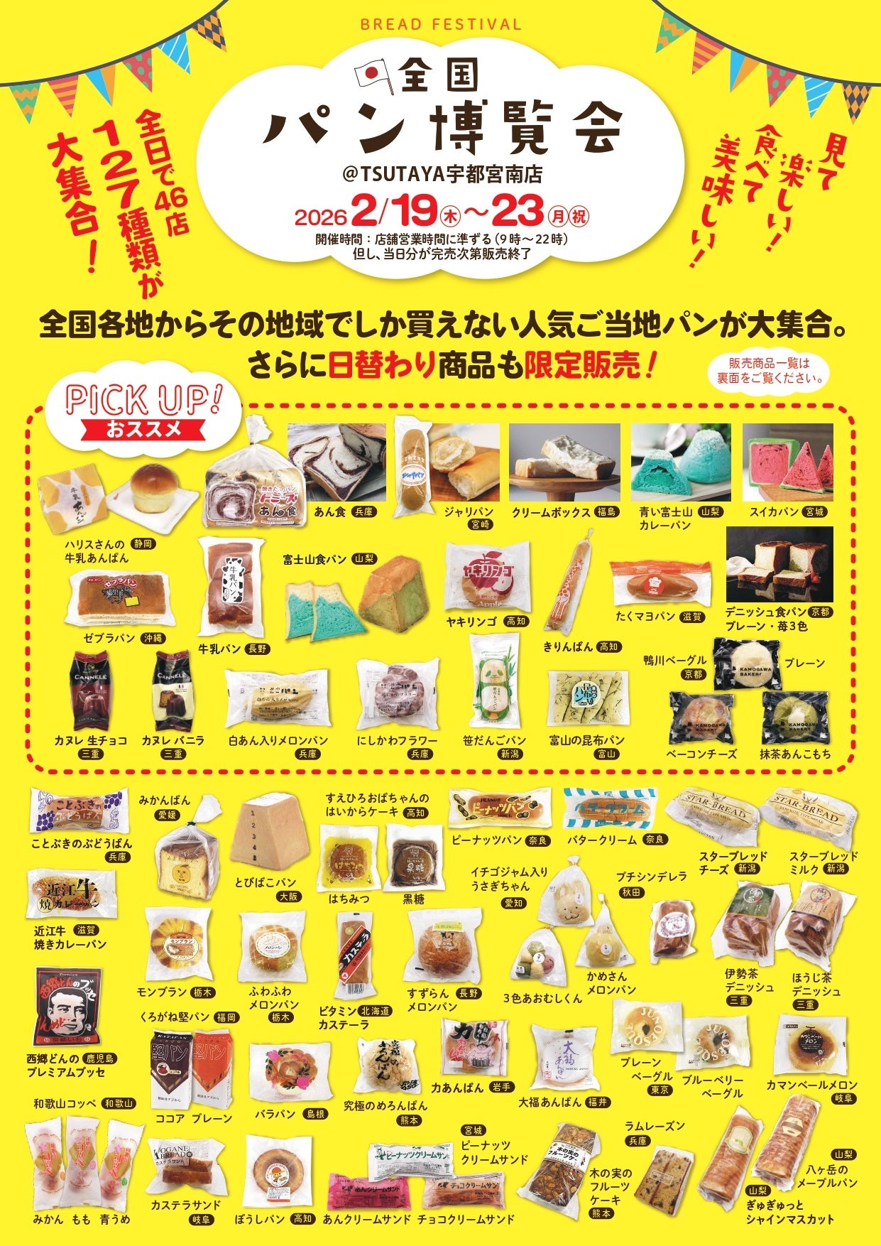 カルチュア・エクスペリエンス株式会社(本社:東京都千代田区、代表取締役社長:鎌浦 慎一郎)は、全国のご当地パンを集めたイベント『全国パン博覧会』を各地で開催しています。2026年2月は、「TSUTAYA 桑野店」(福島県郡山市)、「フタバ図書 TSUTAYA TERA イオンモール福岡店」(福岡県糟屋郡)、「蔦屋書店 茂原店」(千葉県茂原市)、「TSUTAYA BOOK STORE AIZU」(福島県会津若松市)、「TSUTAYA BOOK STORE 福島南」(福島県福島市)、「TSUTAYA 宇都宮南店」(栃木県宇都宮市)で、2月4日(水)より順次開催いたします。