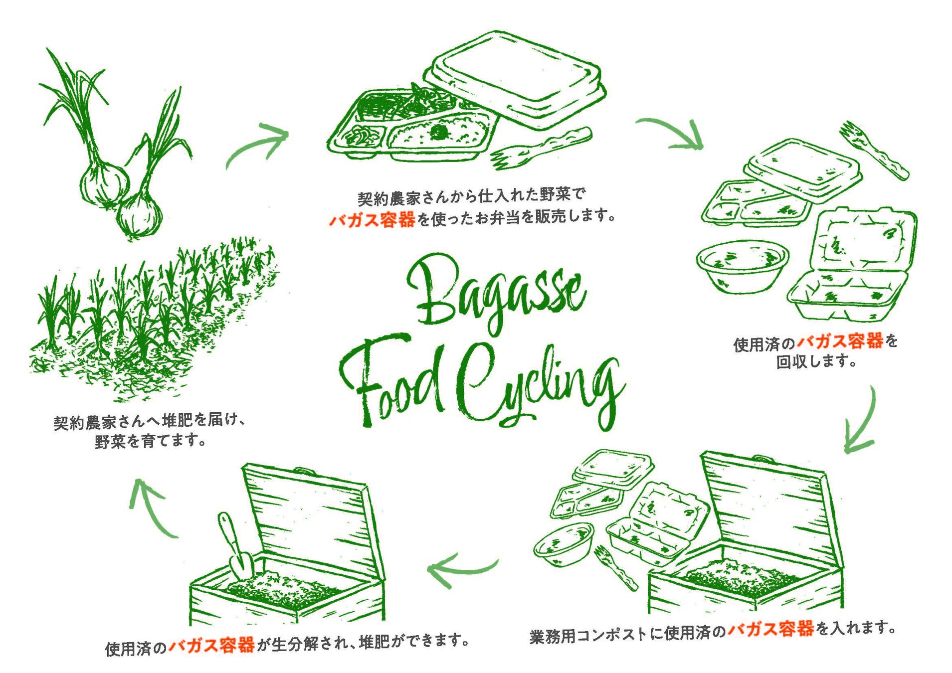 バガス(サトウキビ搾汁後の繊維)を原料とする本容器は、環境負荷の低減と使い勝手の両立が評価され、イベント内の全出店店舗で採用されます。また、今回は使用済容器の一部を回収、洗浄、破砕し、土壌改良剤として使用する実証実験も予定しております。これは、当社が提唱する循環型消費モデル「バガスフードサイクリング」を実現し、CO2排出量削減をはじめとする環境負荷軽減への貢献を前進させる取り組みとなります。