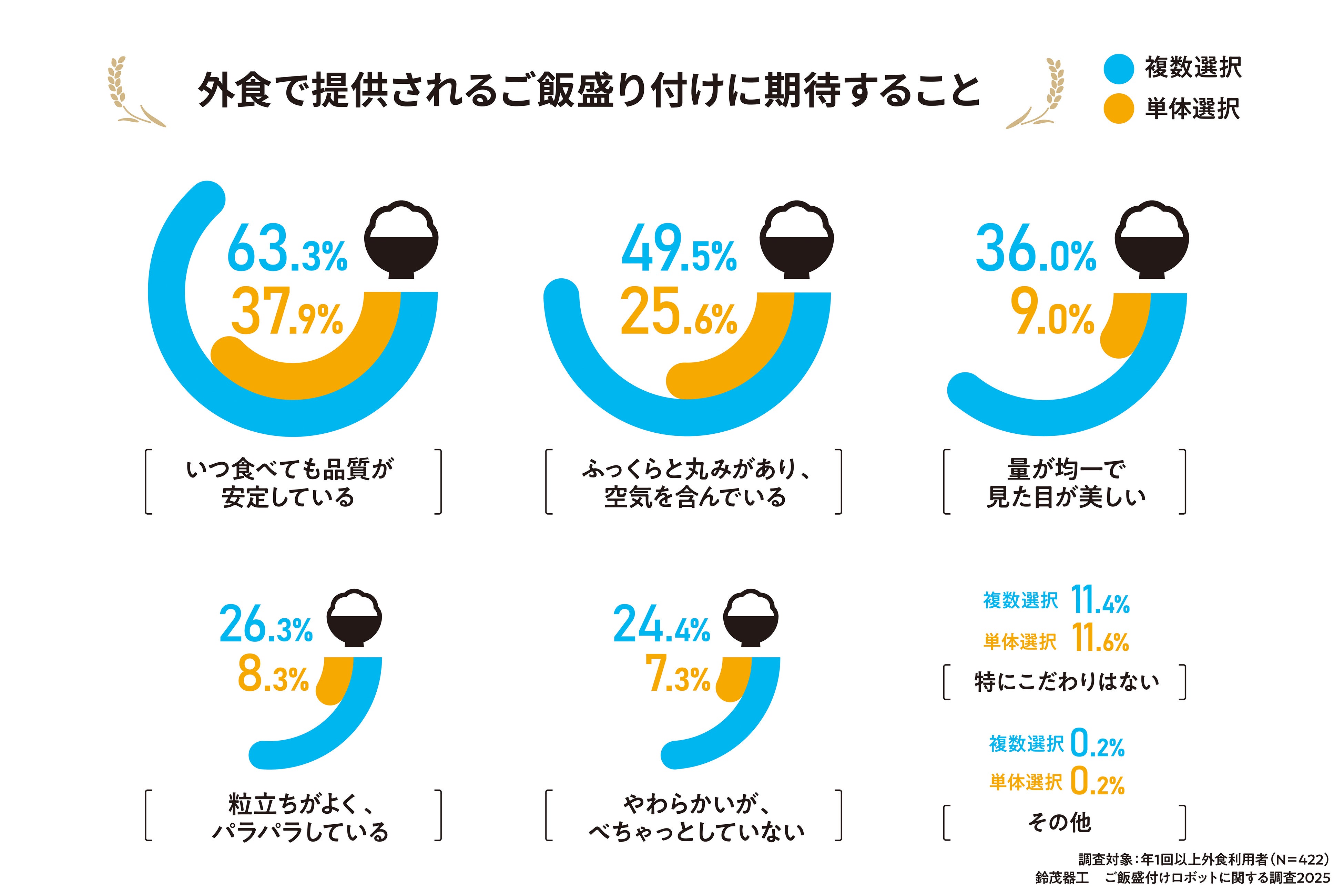 外食で提供されるご飯において「いつ食べても品質が安定していること」を求める声は63.3%と最も多く、「適量」・「衛生」に加えて「品質の安定」へのニーズに対し、ロボットが最適解として認識されています。