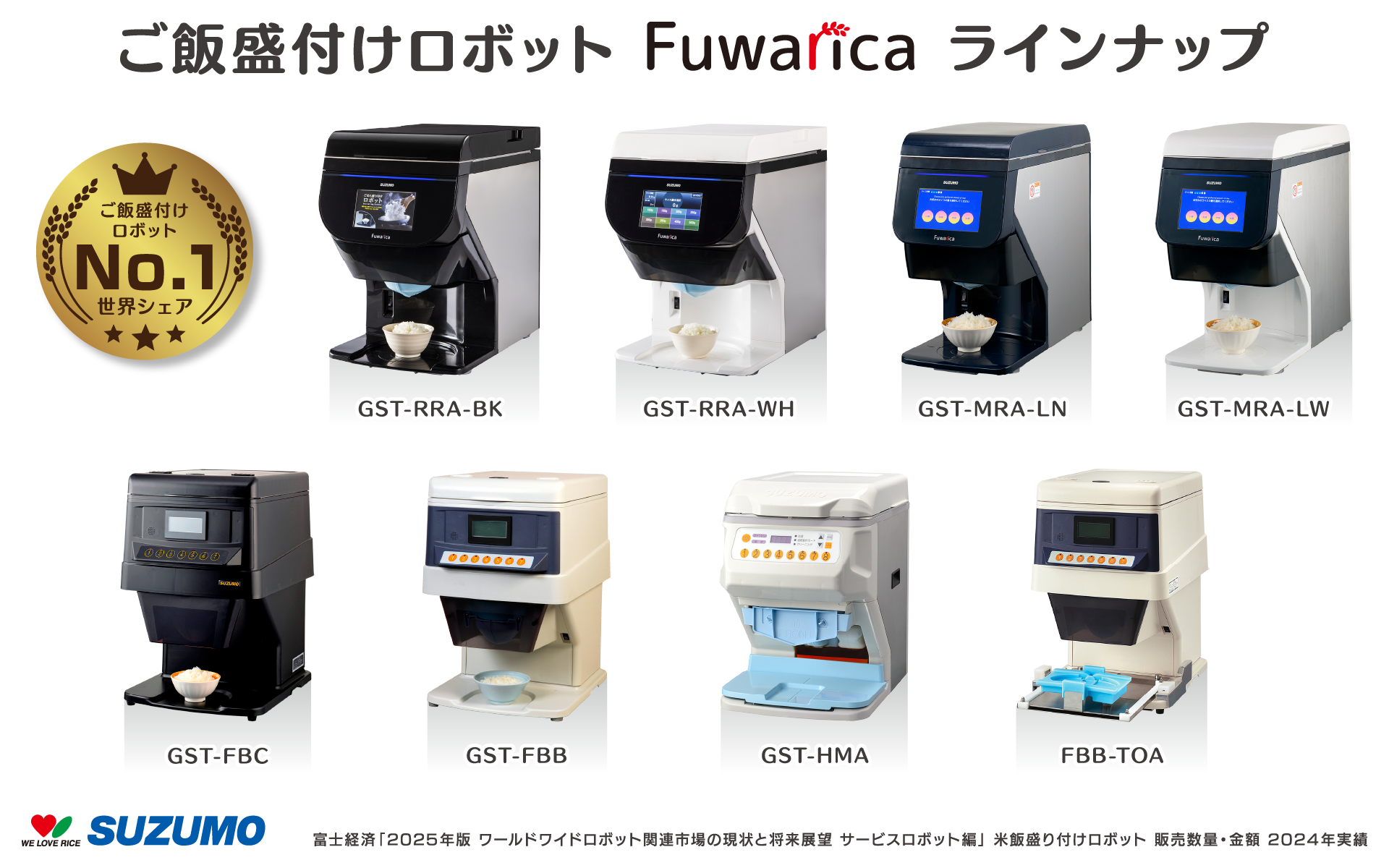 鈴茂器工は1981年、世界初の寿司ロボットを開発し、以来、米飯加工ロボットのリーディングカンパニーとして業界を牽引しています。世界90か国以上の寿司、おむすび、丼ものなど、様々な食のシーンで幅広く利用されています。寿司ロボットとご飯盛付けロボットにおいては、【世界市場】【国内市場】ともにシェアNo.1を獲得(出典:富士経済「2025年版 ワールドワイドロボット関連市場の現状と将来展望 サービスロボット編」寿司ロボット・米飯盛り付けロボット 販売数量・金額2024年実績)。第20回外食アワード2023(主催:外食産業記者会)を受賞するなど、業界でも注目を集めております。