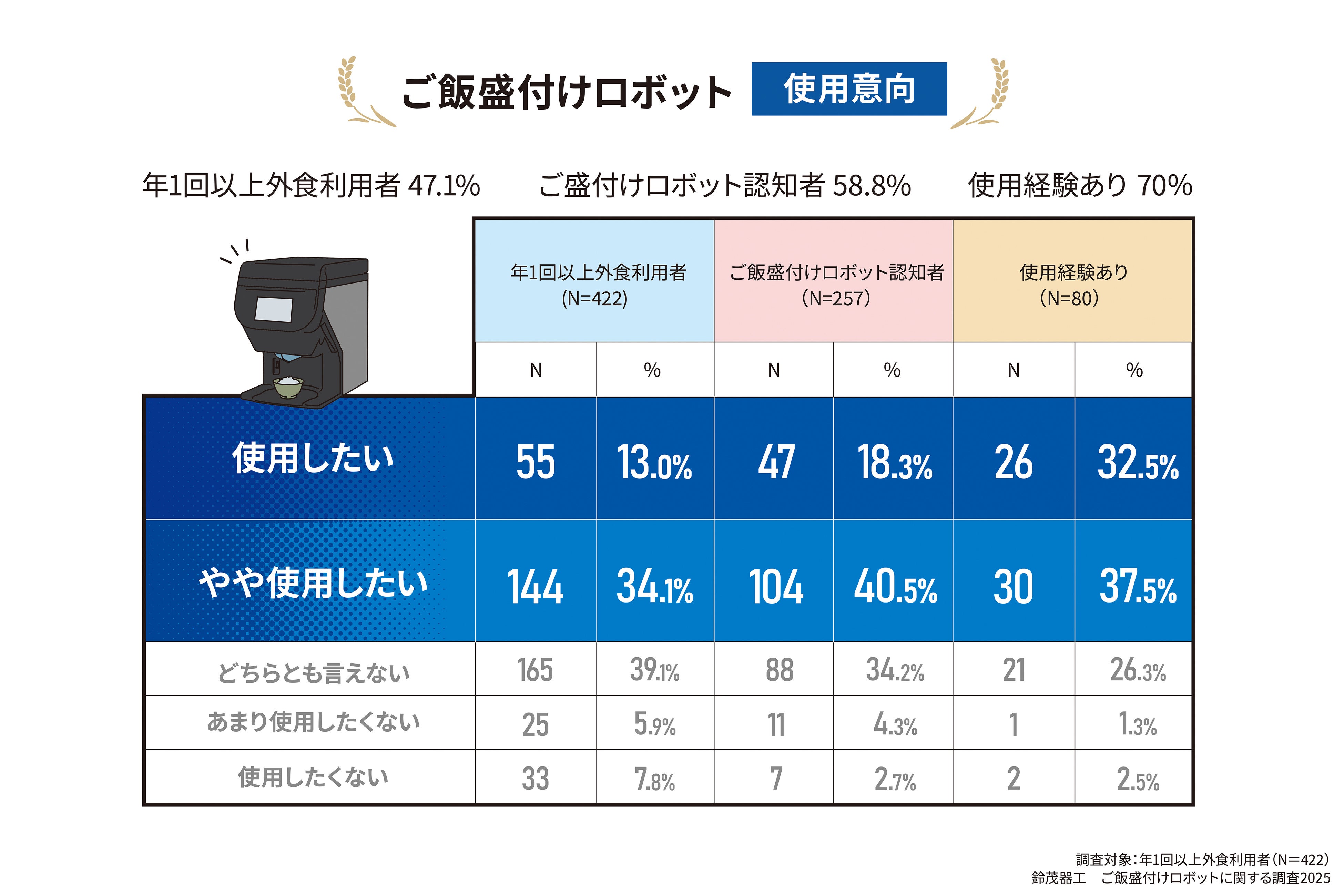 今後の使用意向は、年1回以上外食をする人全体では47.2%にとどまる一方、使用経験者では70.0%に達しました。認知や体験が進むほど評価が高まり、ご飯盛付けロボットは「使えば良さが伝わる」存在であることを示す結果となりました。