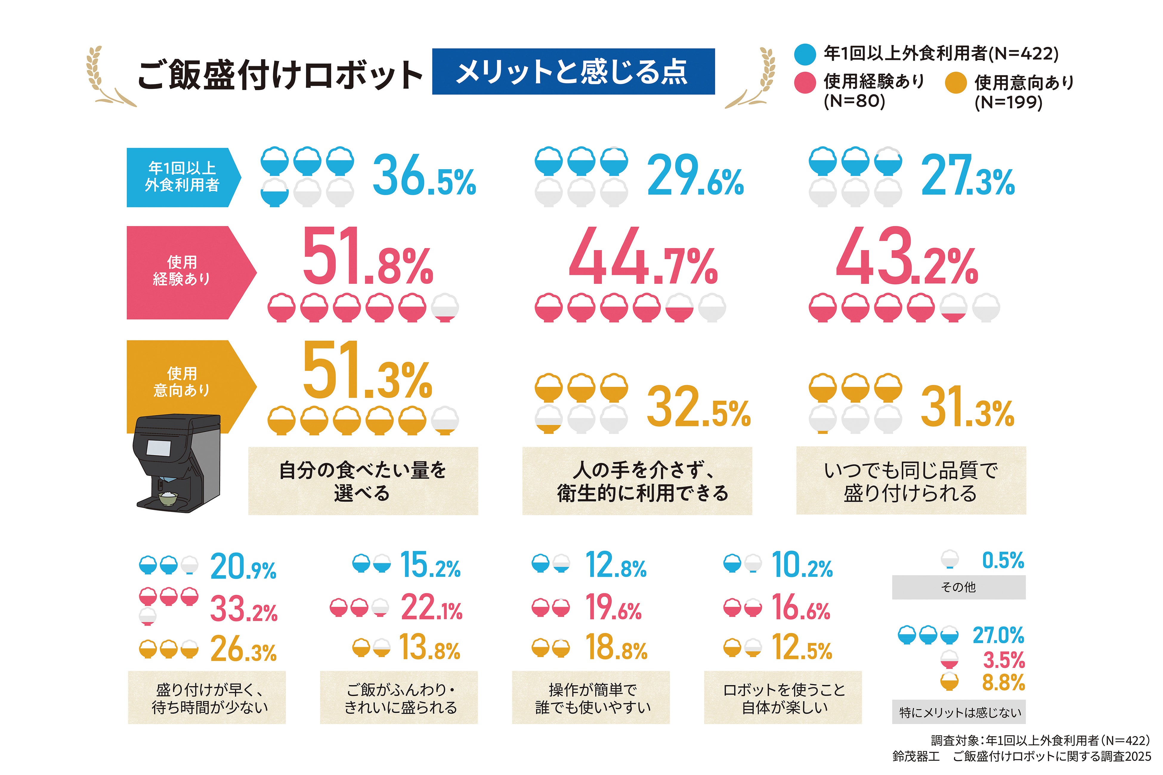 鈴茂器工株式会社(本社:東京都中野区、代表取締役社長:谷口徹)は、全国の20歳~69歳の男女500名を対象に外食頻度に関する調査を実施し、そのうち年1回以上外食をする422名を対象に、ご飯盛付けロボットに関する調査を行いました。