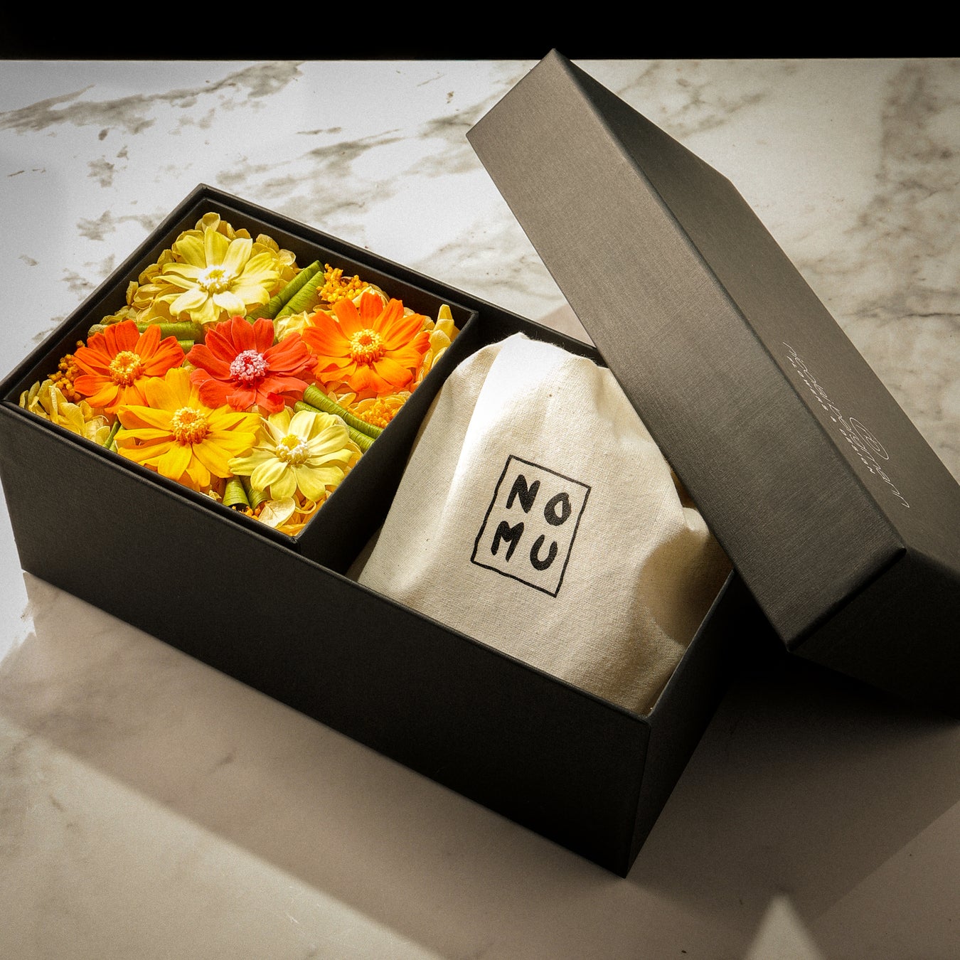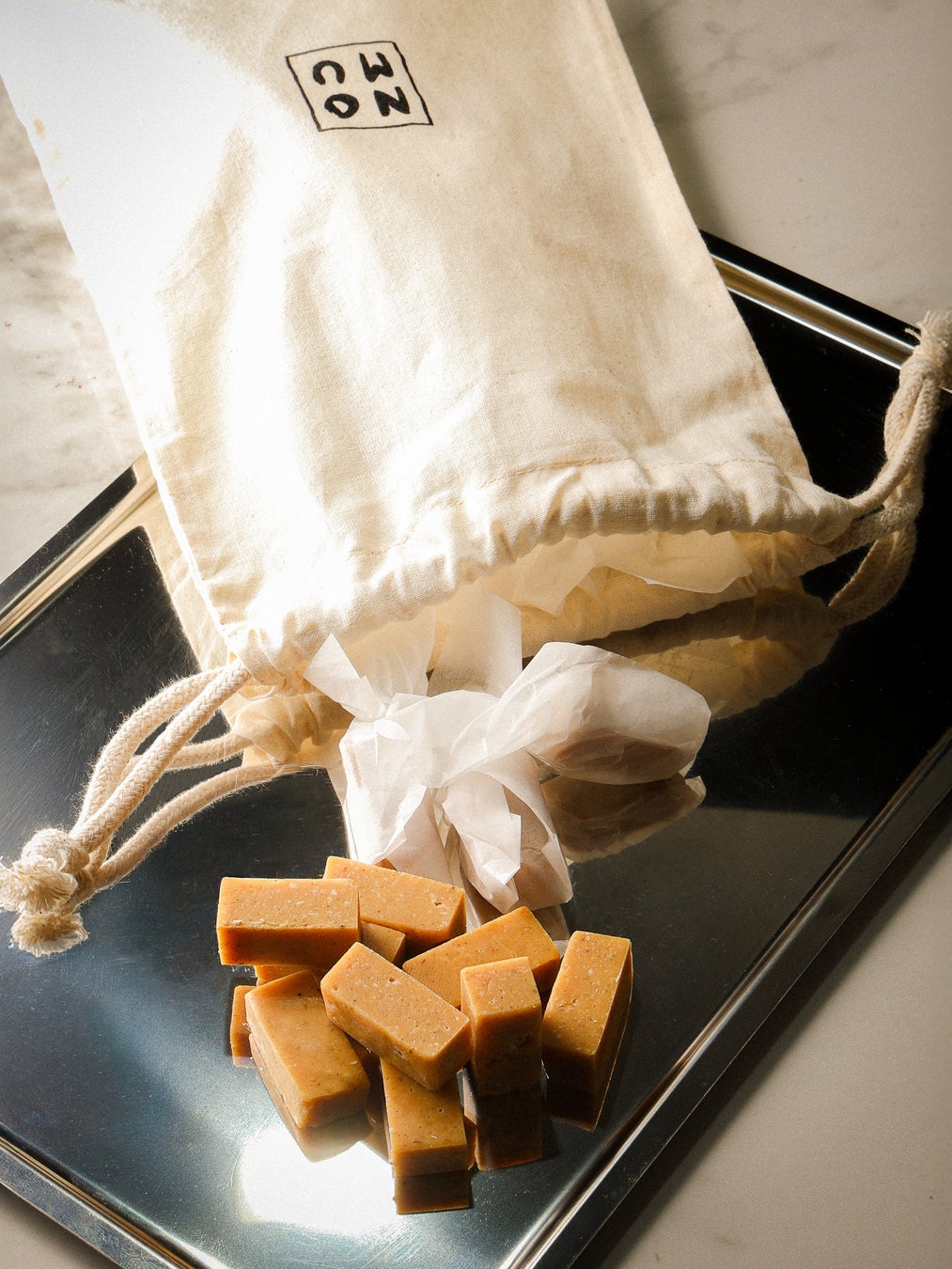 NOMUのロゴ入りコットン巾着に、個包装のキャラメル15個入り。個包装のため、ご自分へのご褒美はもちろん、ご家族やおともだち、オフィスなど、あらゆるシーンでみなさんでお楽しみいただけます。