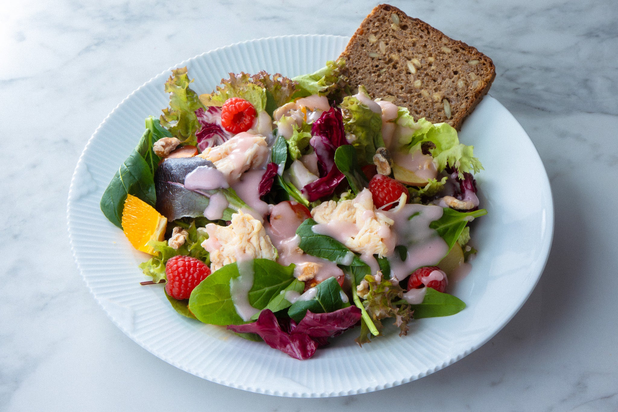みずみずしいサラダリーフに、レモンペッパーで爽やかに仕上げたチキンを合わせ、フルーツの甘みと酸味がアクセントとなったNOMUオリジナルサラダ。りんごとオレンジのフレッシュさと、ラズベリーとブルーベリーの華やかな酸味が、ひと口ごとに広がり、ローストくるみの香ばしさで奥行きを与えます。赤たまねぎを使用したNOMU特製のピンクのドレッシングで全体を上品に仕上げました。軽やかながら栄養価の高い、満足感のある一皿です。