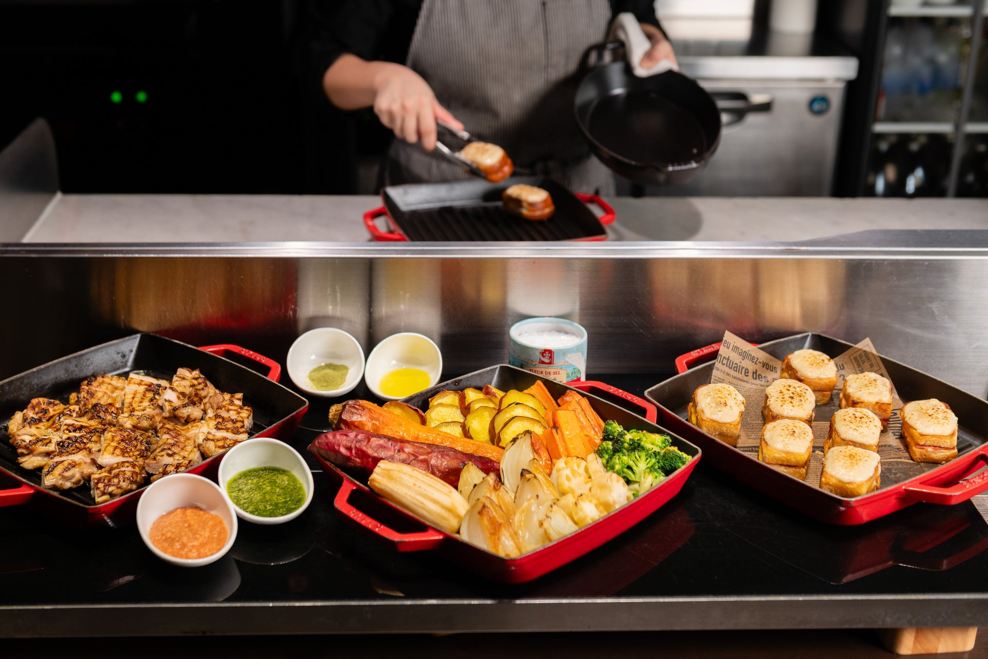 ライブキッチンの「エッグステーション」では、オムレツを実演し、プレーンに加え「大阪オムレツ」「野菜オムレツ」の3種類をご用意します。また、店内の窯で焼き上げる地鶏やグリル野菜は、塩やオリーブオイル、トマト味噌やサルサヴェルデなど、イタリアンならではのソースとともにお楽しみいただけます。