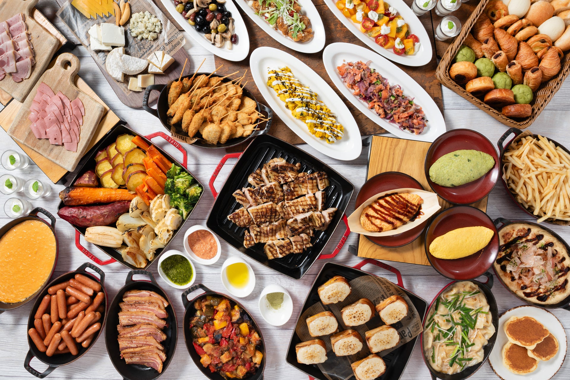 ライブキッチンの「エッグステーション」では、オムレツを実演し、プレーンに加え「大阪オムレツ」「野菜オムレツ」の3種類をご用意します。また、店内の窯で焼き上げる地鶏やグリル野菜は、塩やオリーブオイル、トマト味噌やサルサヴェルデなど、イタリアンならではのソースとともにお楽しみいただけます。