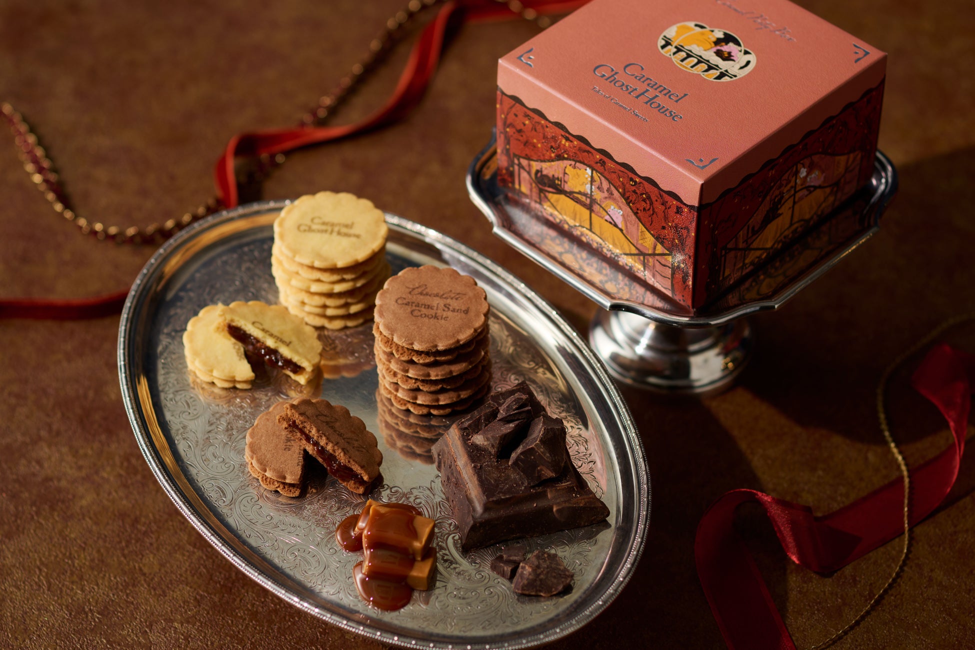 シーズンアソートとして、高い人気を誇るキャラメルゴーストハウスパーティボックスシリーズ。今回は、定番の『キャラメルサンドクッキー』 と1月に新発売された期間限定の『キャラメルサンドクッキー ショコラ』を詰め合わせました。丁寧に炊き上げたくちどけの良いキャラメルに、紅茶葉を加え、ほのかな塩味とバター香るクッキーでサンドした定番の味わい。そして、ショコラを加えたキャラメルをココアクッキーでサンドした、今だけの味わい。2つの個性が織りなす今だけのアソートをお楽しみください。
