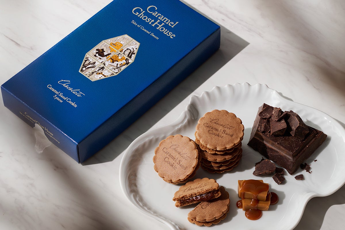 シーズンアソートとして、高い人気を誇るキャラメルゴーストハウスパーティボックスシリーズ。今回は、定番の『キャラメルサンドクッキー』 と1月に新発売された期間限定の『キャラメルサンドクッキー ショコラ』を詰め合わせました。丁寧に炊き上げたくちどけの良いキャラメルに、紅茶葉を加え、ほのかな塩味とバター香るクッキーでサンドした定番の味わい。そして、ショコラを加えたキャラメルをココアクッキーでサンドした、今だけの味わい。2つの個性が織りなす今だけのアソートをお楽しみください。
