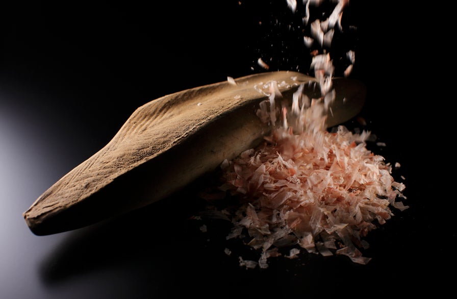 カビ付け、天日干しを2回以上繰り返した鰹節を「枯節」と呼びます。カビ付けにより、節の水分が減少するとともに、魚臭さの少ない上品な風味に変化します。にんべんでは4回以上カビ付けと天日干しを繰り返したものを「本枯鰹節」とし、鰹節の最高級品となります。にんべんは1699年の創業当時より鰹節の商いを始め、今日でも昔ながらの製法を受け継いだ「本枯鰹節」を通じて日本の味を現代に伝えています。