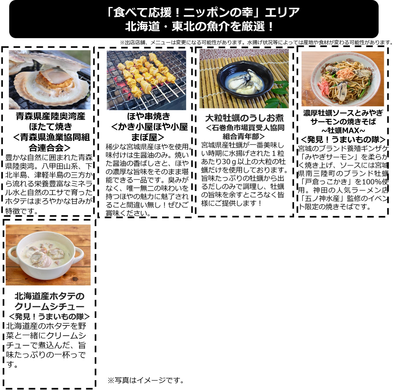 発見!ふくしまお魚まつりと連携し、北海道・東北地方の厳選した魚介料理を集めた「食べて応援!ニッポンの幸」エリアを設けます。一部の国・地域による日本の水産物の輸入規制の影響を受けたホタテなど、日本の海の幸のおいしさを発信し、日本の漁業・水産業を応援することを目的としています。