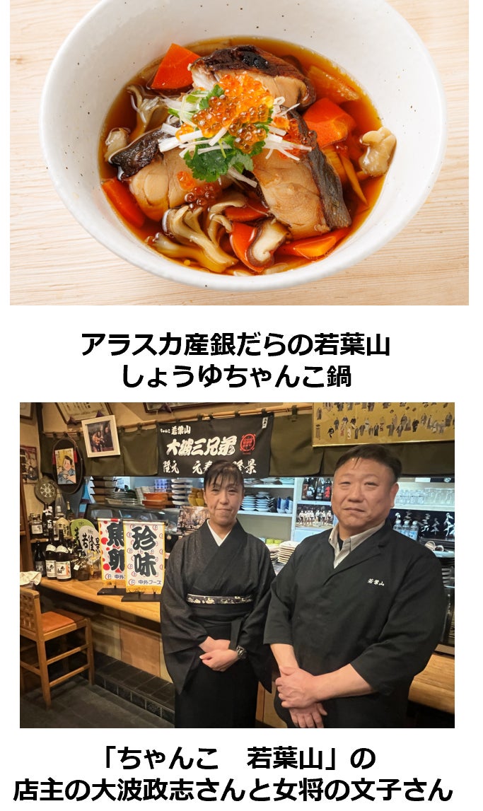 「アラスカシーフードマーケティング協会&中外フーズ」ブースでは、100%天然のアラスカ産銀だらを使い、大相撲の若元春ら〝大波三兄弟〟の両親が営む福島市の人気店「ちゃんこ 若葉山」の店主で元力士の大波政志さんが監修した「アラスカ産銀だらの若葉山しょうゆちゃんこ鍋」を販売します。伊達市の中外フーズが提供するアラスカ産銀だらは、清涼で水温の低い海に育まれ、極上の脂をたくわえています。アラスカではギンダラを含む全漁業が、厳しい漁業管理のもと漁獲されています。また漁獲後に急速凍結で鮮度を保持しており、天然の美味しさを存分に堪能できます。