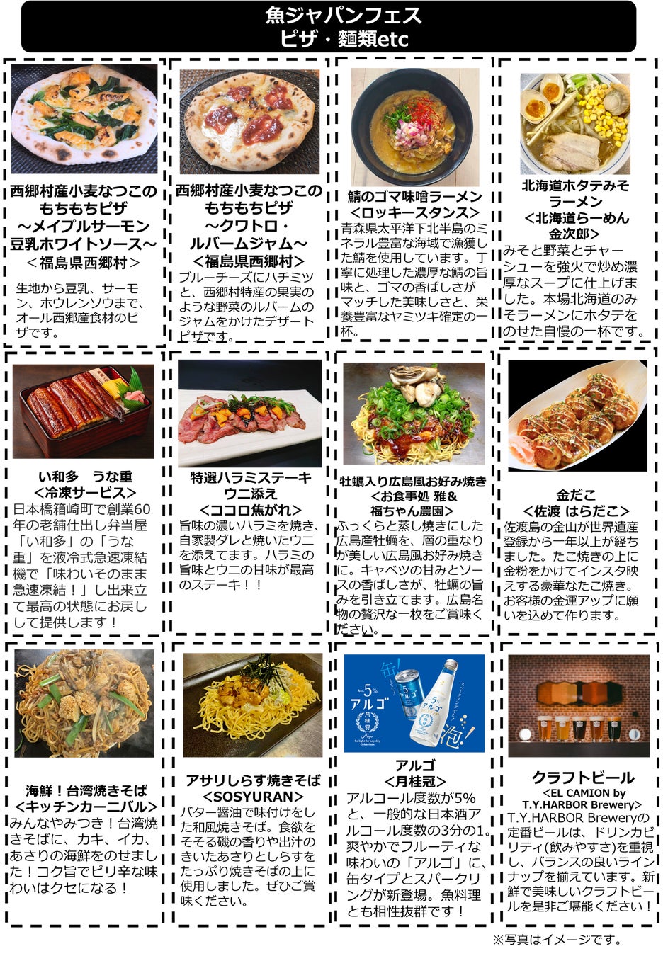 福島県の玄関口に位置し、豊かな自然に恵まれ、首都圏からのアクセスも抜群の福島県西郷村が4年連続で出店。西郷村は日本の〝村〟としては唯一、新幹線の駅があり、魅力的な観光スポットやおいしいグルメも盛りだくさんです。今回は、新たな特産品として栽培に力を入れているブランド小麦「なつこ」を100%使ったもちもち生地のピザを開発。福島の人気石窯本格ピザキッチンカー「PIZZA BRAVO」(ピザ・ブラボー)とコラボし、「西郷村産小麦なつこのもちもちピザ~メイプルサーモン豆乳ホワイトソース~」と「同~クワトロ・ルバームジャム~」を限定販売します。西郷村産米を使って仕込んだ日本酒「甲子山」の試飲・販売も実施。阿武隈川の清流で丹精込めて育てられた「メイプルサーモン」の海鮮丼は毎年、長い行列ができる連日完売の人気メニュー。村の観光名所である「ますつり公園」の出張ニジマス釣り堀も楽しめます。