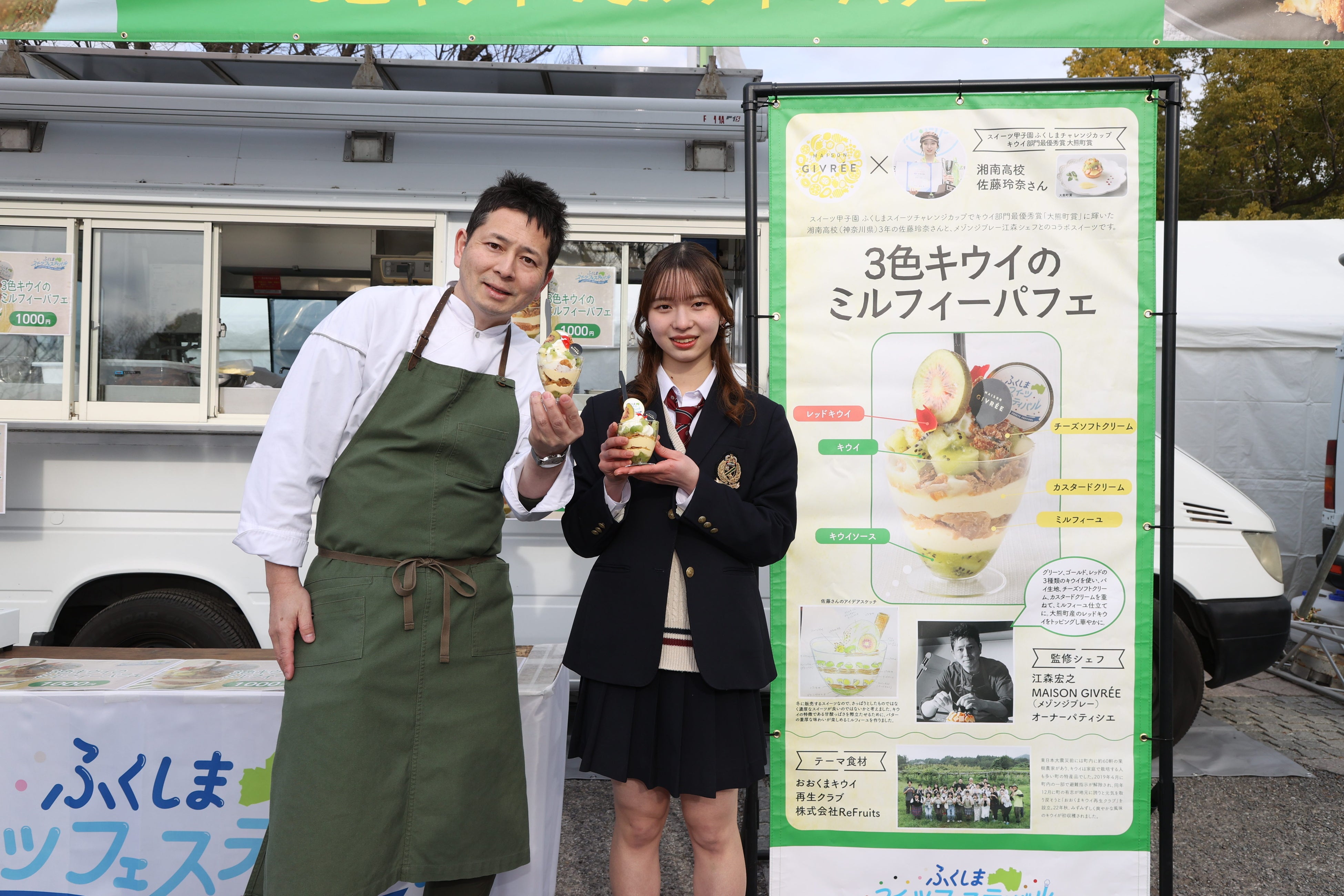 ふくしまスイーツフェスティバルは、スイーツの力で福島の復興を応援することを目的に開催。大熊町のキウイ、富岡町のパッションフルーツ、楢葉町のサツマイモ、広野町のバナナをそれぞれ使った4種類のスイーツが味わえます。スイーツは、昨年8月に福島県のJヴィレッジで開かれた各町特産品を使ったスイーツ作りのコンテスト「スイーツ甲子園 ふくしまチャレンジカップ」で、各町賞に輝いた高校生4組と審査員の著名パティシエが考案しました。