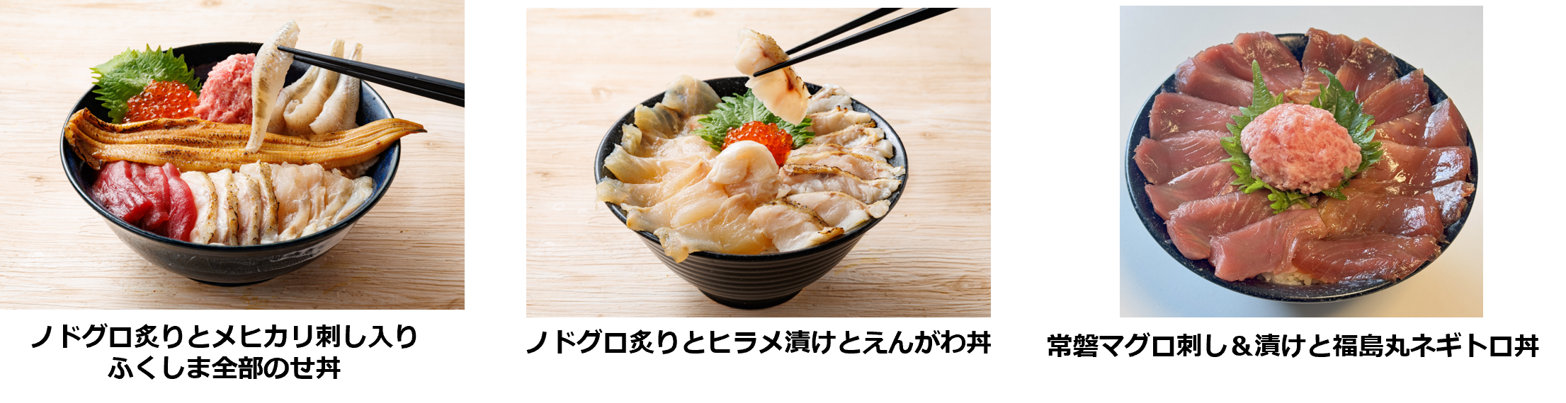 発見!ふくしまお魚まつりの人気ブース「なこそ処 ちょんまげ」では、海鮮丼のネタが充実!福島自慢の魚介をてんこ盛りにした「ノドグロ炙りとメヒカリ刺し入りふくしま全部のせ丼」には、ほとんど地元でしか出回らないメヒカリ刺しと、いわき・小名浜漁港に水揚げされた本マグロの幼魚のメジマグロ刺しの新ネタに、〝白身のトロ〟と呼ばれるノドグロの炙り、「常磐もの」の代表格のヒラメの漬け、脂ののった焼きアナゴ、福島県立小名浜海星高等学校の生徒が練習船「福島丸」で漁獲したマグロのネギトロに、彩りのイクラを添え、全7種類の豪華さです。メヒカリは、唐揚げや干物が定番ですが、地元では刺し身や寿司ネタとしても食されており、水揚げされたばかりの新鮮なメヒカリを一尾ずつ丁寧に切り身にし、急速冷凍して真空パックし新鮮な状態で提供。メジマグロはほどよい脂がのり、すっきりとした味わいが特徴です。ノドグロ炙りとヒラメ漬けに、コリコリとしたヒラメのえんがわを添えた「ノドグロ炙りとヒラメ漬けとえんがわ丼」と、メジマグロ刺しと漬け、ネギトロを盛った「常磐マグロ刺し&漬けと福島丸ネギトロ丼」のリニューアルメニューも登場します。