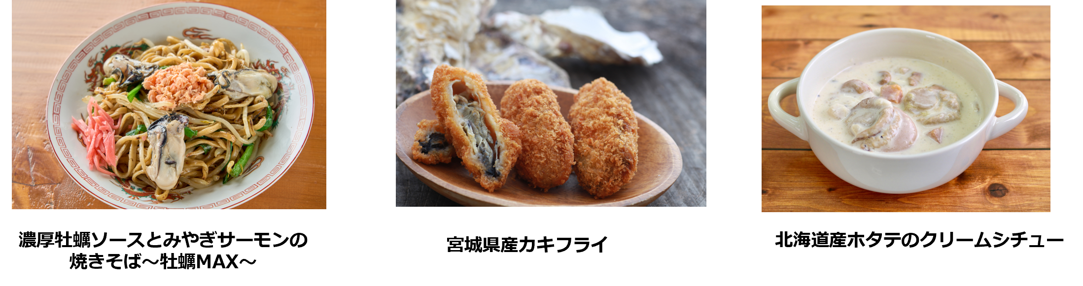 「発見!うまいもの隊」のキッチンカーでは、宮城県や北海道の厳選した魚介を使用したメニューをご用意しています。「濃厚牡蠣ソースとみやぎサーモンの焼きそば~牡蠣MAX~」は、東京・神田の人気ラーメン店「五ノ神水産」が監修したイベント限定メニュー。宮城のブランド養殖ギンザケ「みやぎサーモン」を柔らかく焼き上げ、ソースには宮城県南三陸町のブランド牡蠣「戸倉っこかき」を100%使用しています。宮城・三陸の豊かな海で育った濃厚でジューシーなカキを使った「宮城県産カキフライ」や、北海道のプリプリのホタテを野菜と煮込んだ「北海道産ホタテのクリームシチュー」もどうぞ!