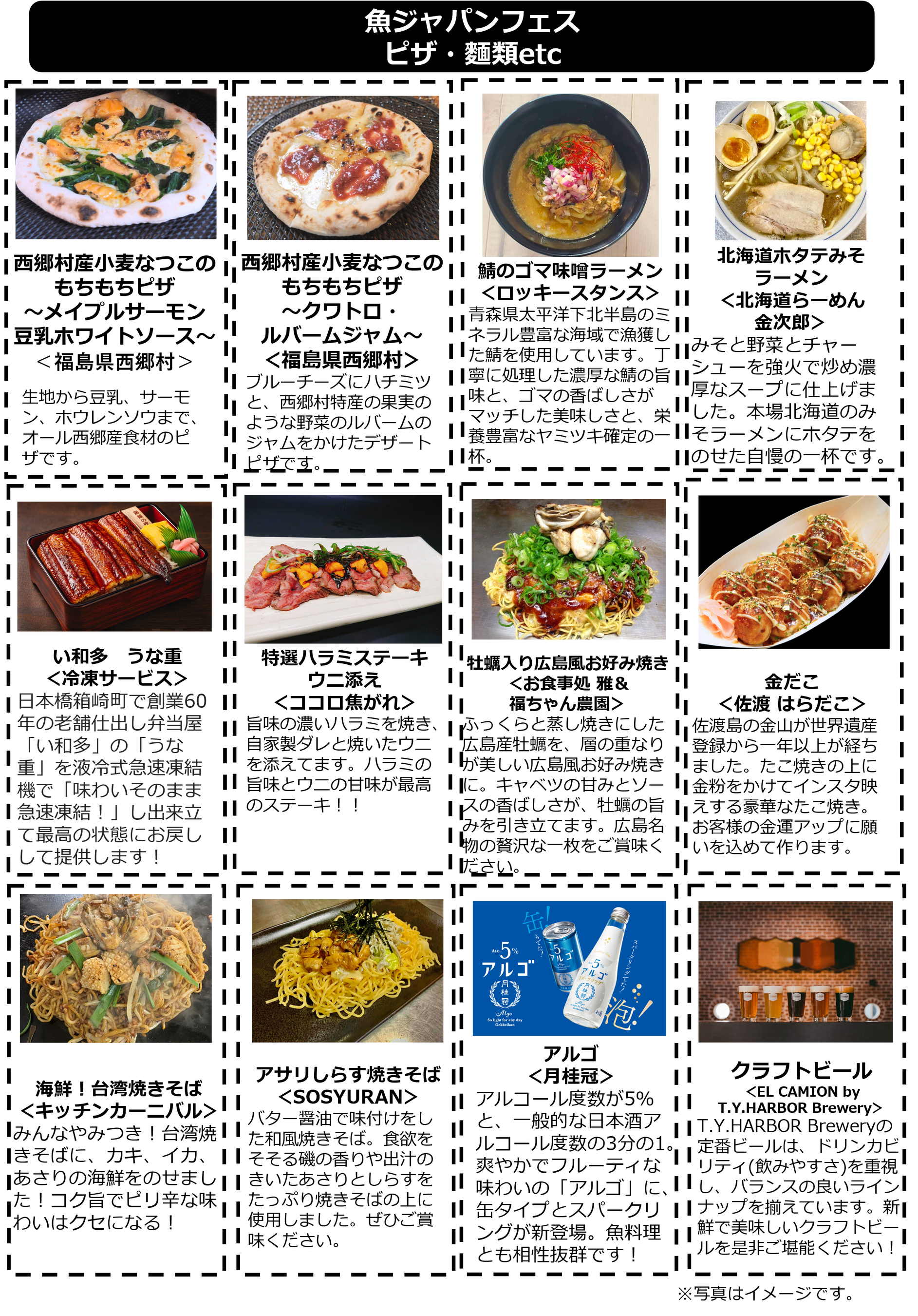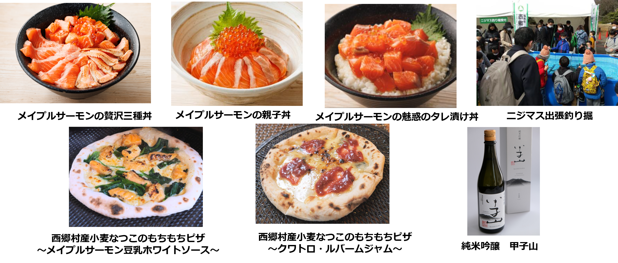 福島県の玄関口に位置し、豊かな自然に恵まれ、首都圏からのアクセスも抜群の福島県西郷村が4年連続で出店。西郷村は日本の〝村〟としては唯一、新幹線の駅があり、魅力的な観光スポットやおいしいグルメも盛りだくさんです。今回は、新たな特産品として栽培に力を入れているブランド小麦「なつこ」を100%使ったもちもち生地のピザを開発。福島の人気石窯本格ピザキッチンカー「PIZZA BRAVO」(ピザ・ブラボー)とコラボし、「西郷村産小麦なつこのもちもちピザ~メイプルサーモン豆乳ホワイトソース~」と「同~クワトロ・ルバームジャム~」を限定販売します。西郷村産米を使って仕込んだ日本酒「甲子山」の試飲・販売も実施。阿武隈川の清流で丹精込めて育てられた「メイプルサーモン」の海鮮丼は毎年、長い行列ができる連日完売の人気メニュー。村の観光名所である「ますつり公園」の出張ニジマス釣り堀も楽しめます。