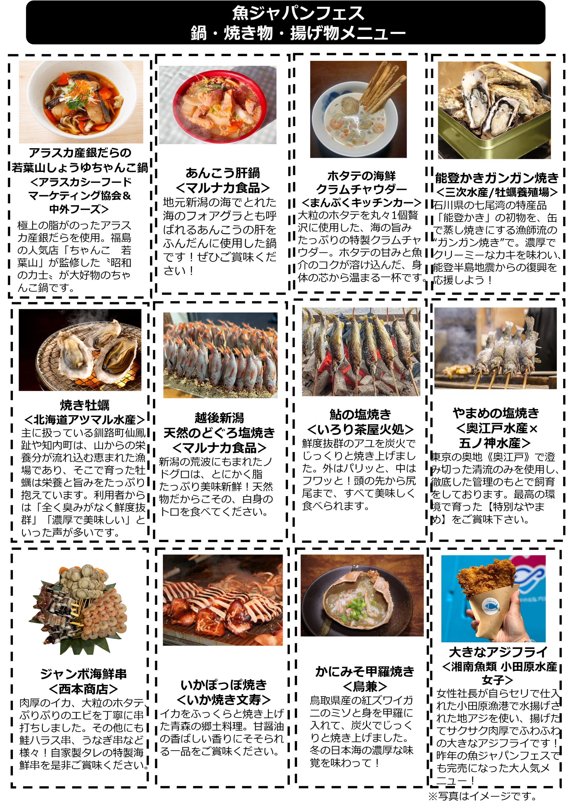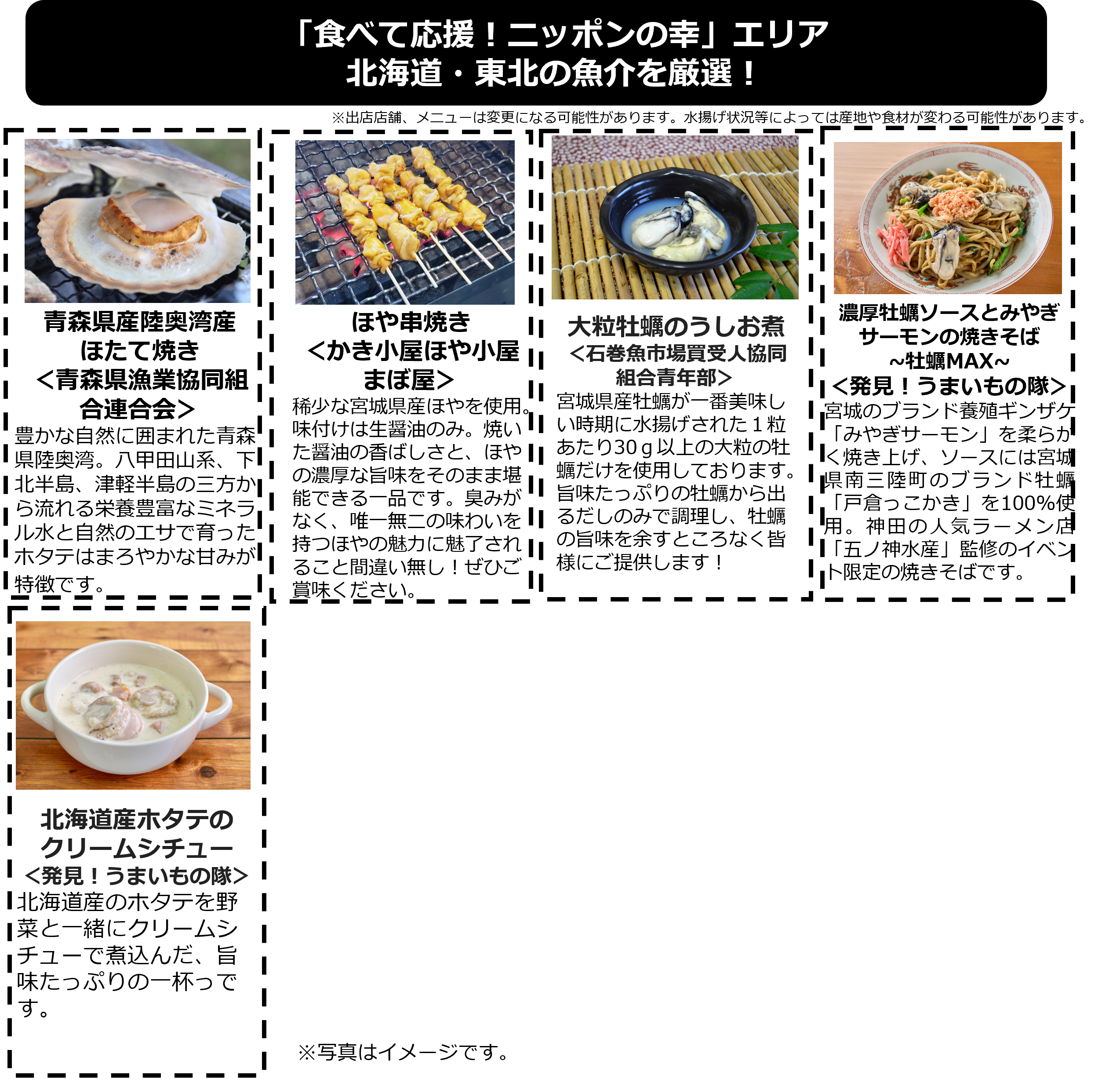 発見!ふくしまお魚まつりと連携し、北海道・東北地方の厳選した魚介料理を集めた「食べて応援!ニッポンの幸」エリアを設けます。一部の国・地域による日本の水産物の輸入規制の影響を受けたホタテなど、日本の海の幸のおいしさを発信し、日本の漁業・水産業を応援することを目的としています。