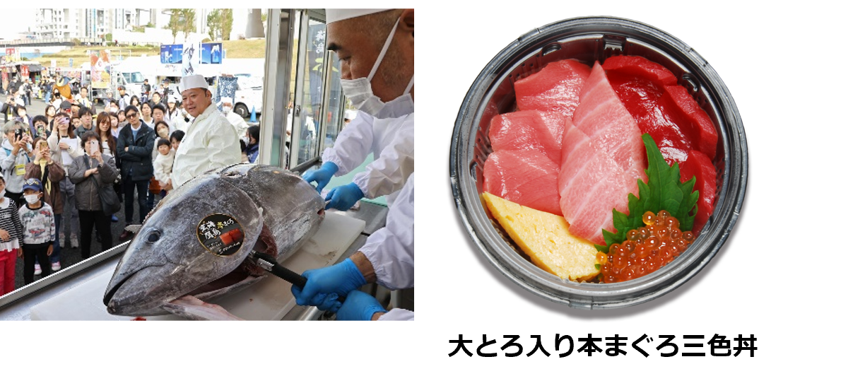 魚のプロの「豊洲かんぺい会」ブースでは、玄界灘の長崎・鷹島で育てられた「生本マグロ」を厳選して直送し、来場者の目の前で「解体ショー」を毎日開催します。さばいたばかりの超新鮮なマグロの味わいは格別です。赤身、中トロ、大トロを食べ比べられる「大とろ入り本まぐろ三色丼」などを提供します。