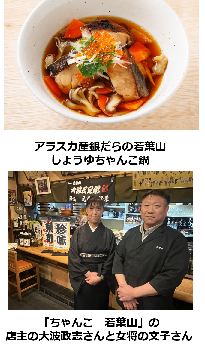 中外フーズが、若元春・若隆景の兄弟の取り組みに懸賞を懸けて応援している〝縁〟から、若葉山とのコラボが実現しました。今は脂ののりがよく高級魚となっている銀だらですが、かつては値段が手ごろで、大波店主によると、相撲部屋のちゃんこ鍋によく使われていたそう。そんな「昭和の力士たちの大好物」を大波店主が蘇らせました。タレに漬け込み、焼いた銀だらの大振りの切り身を器に盛り、きのこと野菜たっぷりのしょうゆ出汁をかけ、ネギ、三つ葉、水菜にイクラものせていただきます。「ホロホロの身を崩しながら食べると、極上の脂が出汁に溶け出し、最高の味わい」(大波店主)となります!
