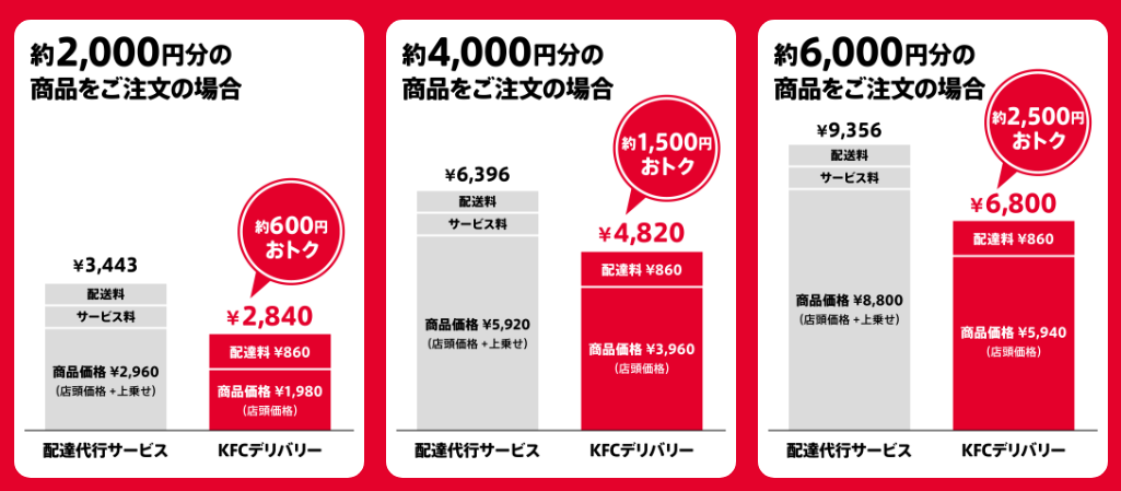 ※配達代行サービス各社の料金は、エリア・配送距離・需要状況等により変動するため、すべての条件下で「KFCデリバリー」が必ずおトクであることを保証するものではございません。
