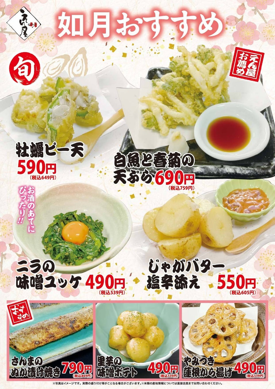 東京と埼玉で展開する海鮮居酒屋「鮨のえん屋」では毎月、季節の旬な食材を使用した限定メニューを販売しています。2月は7種類。冬こそ旨み際立つ「さんまのぬか漬け焼き」に旬の牡蠣をピーマンで包んだ「牡蠣ピー天」。日本の早春の美味しさを楽しんでいただく「白魚と春菊の天ぷら」など旬の味覚を存分にご用意いたしました。どうぞ、この機会にご利用ください。皆様のご来店をスタッフ一同、心よりお待ちしております。