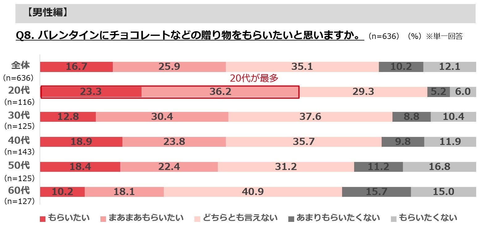 ・バレンタインの贈り物をもらいたい人は4割強、もらいたくない人は2割強。20代はもらいたい人の割合が6割と特に高い。