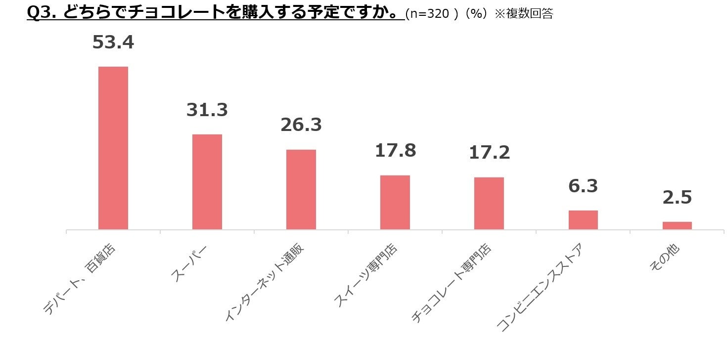 購入場所を2025年と比較すると、「デパート、百貨店」は53.4%と根強い人気ですが、「インターネット通販」が26.3%と、昨年の19.2%から伸長した点が特徴的です。一昨年と昨年の比較ではこのような傾向がみられませんでしたが、より自身の希望にあったチョコレートを手間なく購入できるインターネット通販が評価されつつあるのかもしれません。