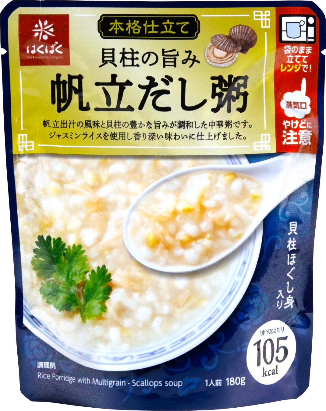 特長 : 帆立出汁の風味と貝柱の豊かな旨みを閉じ込め、シンプルながらも贅沢な中華粥に仕上げました。