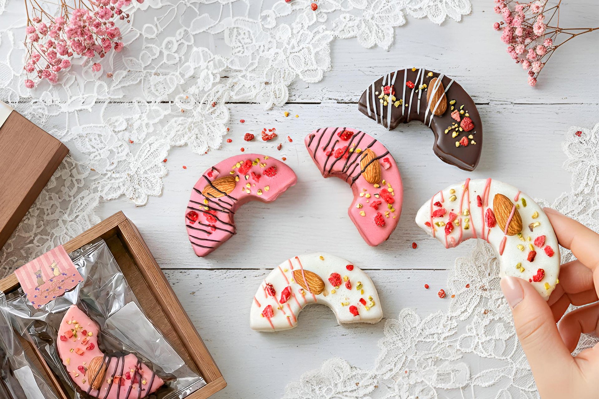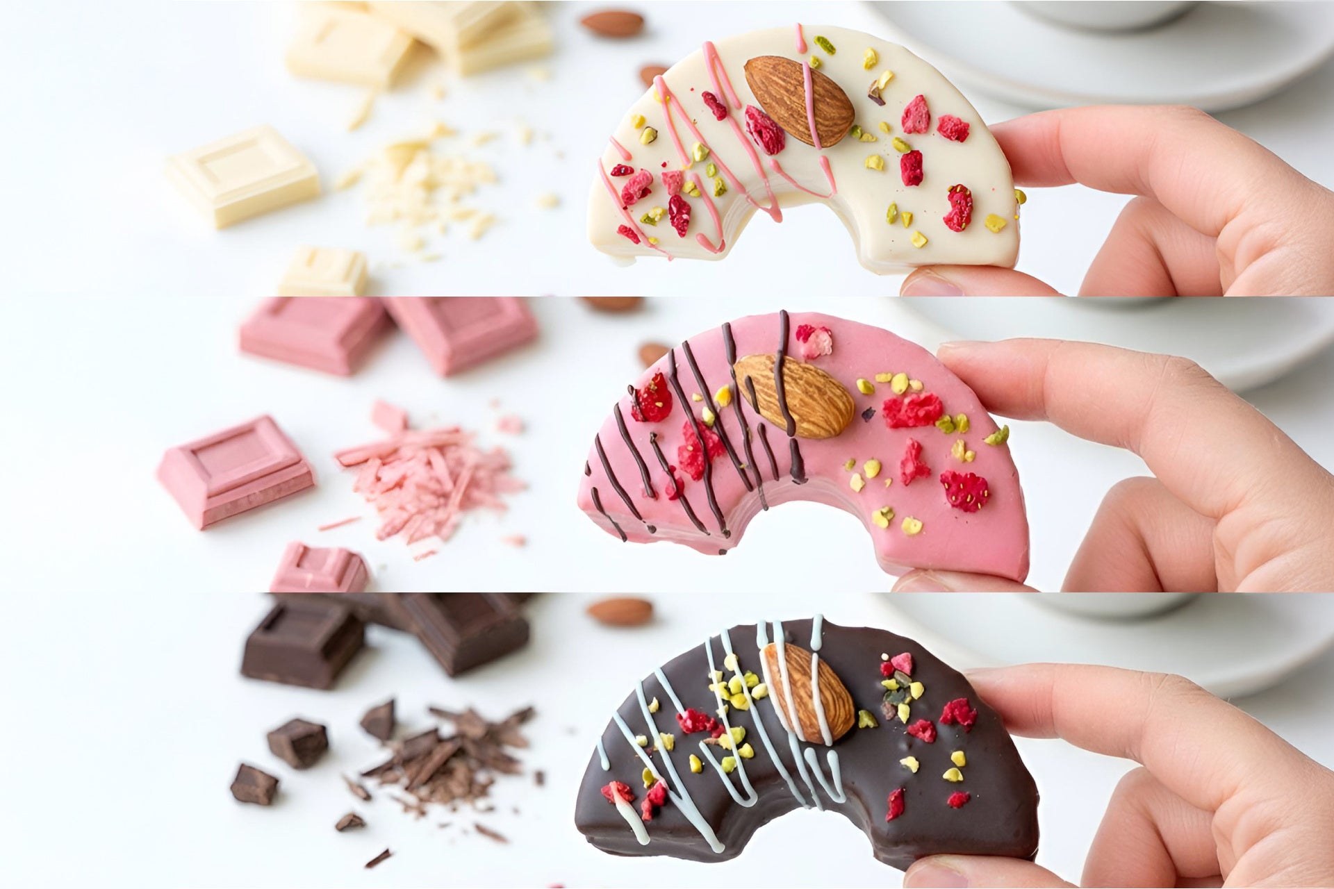ホワイト・ストロベリー・ビター、それぞれ異なるチョコレートをまとわせ、アーモンド、フリーズドライ苺、ピスタチオでひとつひとつ丁寧にデコレーションしています。