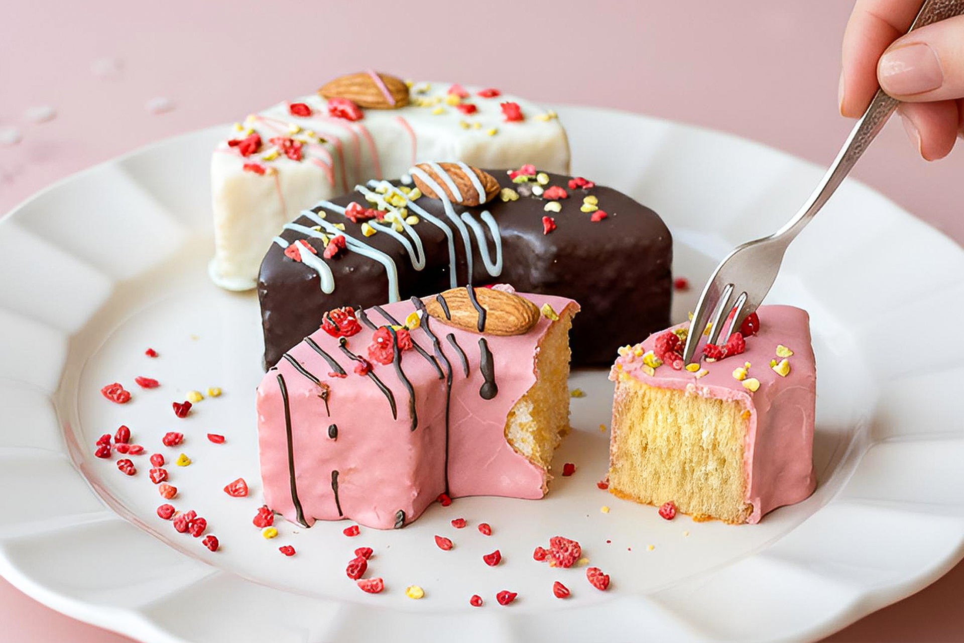 さらに、大粒のアーモンドをのせ、フリーズドライ苺とピスタチオもふんだんにトッピング。仕上げに、それぞれのフレーバーに合わせたチョコレートをライン状にあしらえば、見た目にも華やかな「ミニョンバウム」が完成します。