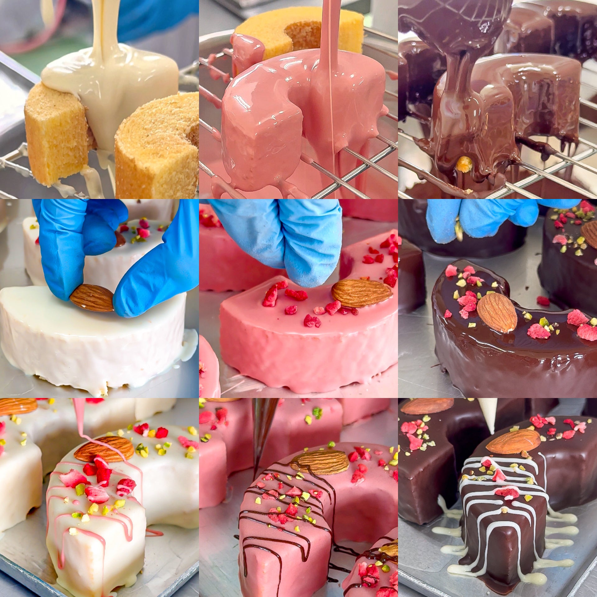 ホワイト・ストロベリー・ビター、それぞれ異なるチョコレートをまとわせ、アーモンド、フリーズドライ苺、ピスタチオでひとつひとつ丁寧にデコレーションしています。