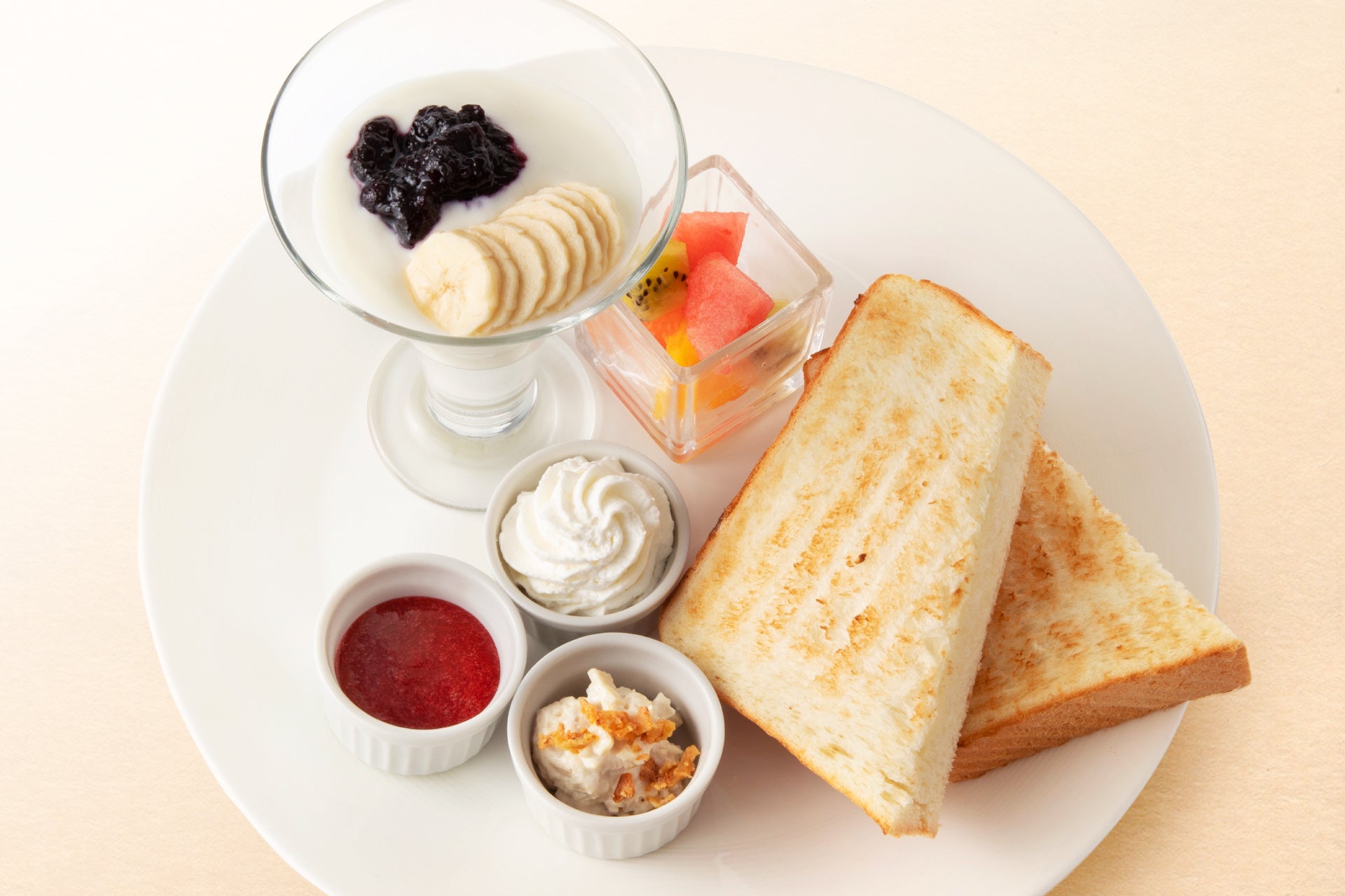 オープンの10:00amから1時間だけの限定メニュー「厚切りトースト&選べるトッピングセット」が登場します。プレートにはブルーベリージャムとバナナをトッピングしたヨーグルトと、角切りフルーツ、そしてほどよく焼いた厚切りトーストを。トーストには8種類のトッピングからお好きなものを3つお選びいただけます。