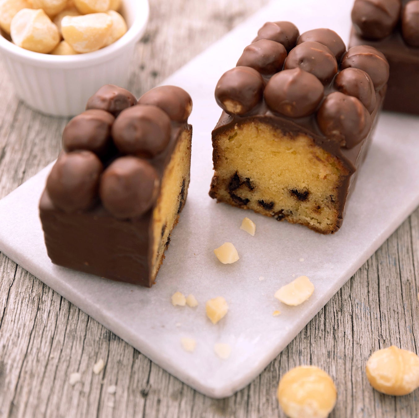 チョコチップ入りのパウンドケーキに、塩味をきか せてローストしたマカダミアナッツを贅沢にのせ、チョコでコーティングしました。
