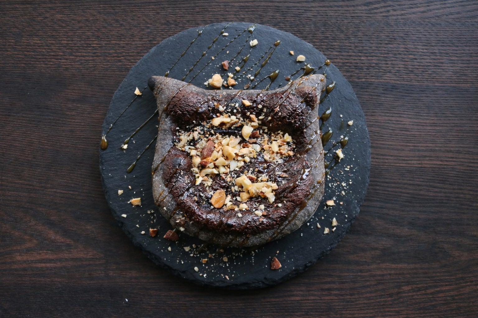 「チョコ“にゃ”ッツ」は、ココアで黒く色付けした猫型生地にチョコレートソースを塗って焼き上げた、黒猫をイメージしたデザートピザです。
