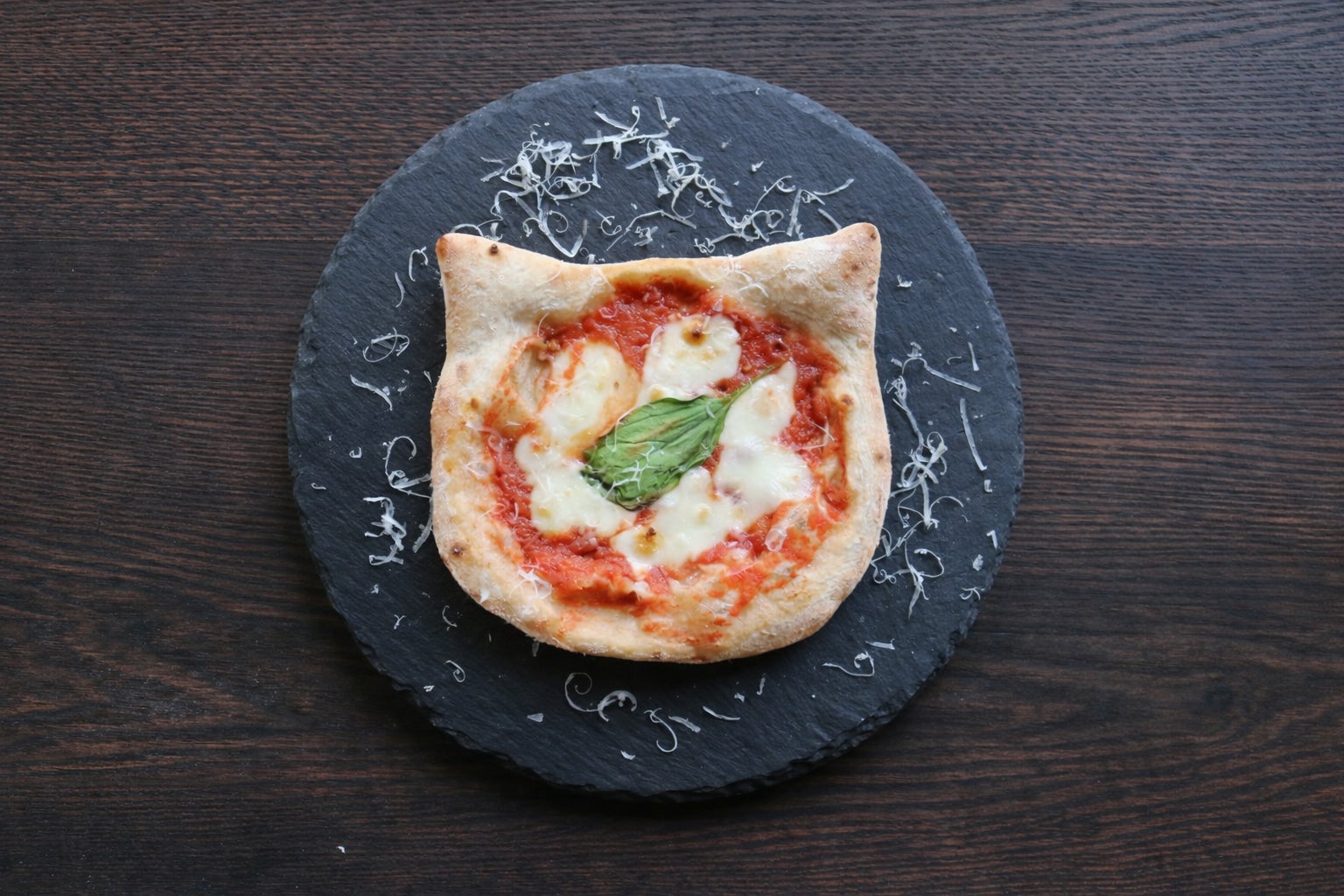 「“にゃ”ルゲリータ」は、石臼挽き小麦を使用した当店オリジナルの生地を猫型に成型し、トマトソース・モッツァレラチーズ・バジルをのせて焼き上げたマルゲリータ。
