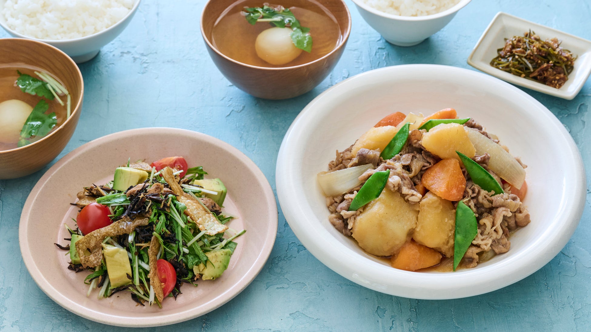 肉じゃが/ごはん/ひじきのサラダ/昆布とかつおのふりかけ/はんぺんとみつ葉のお吸い物