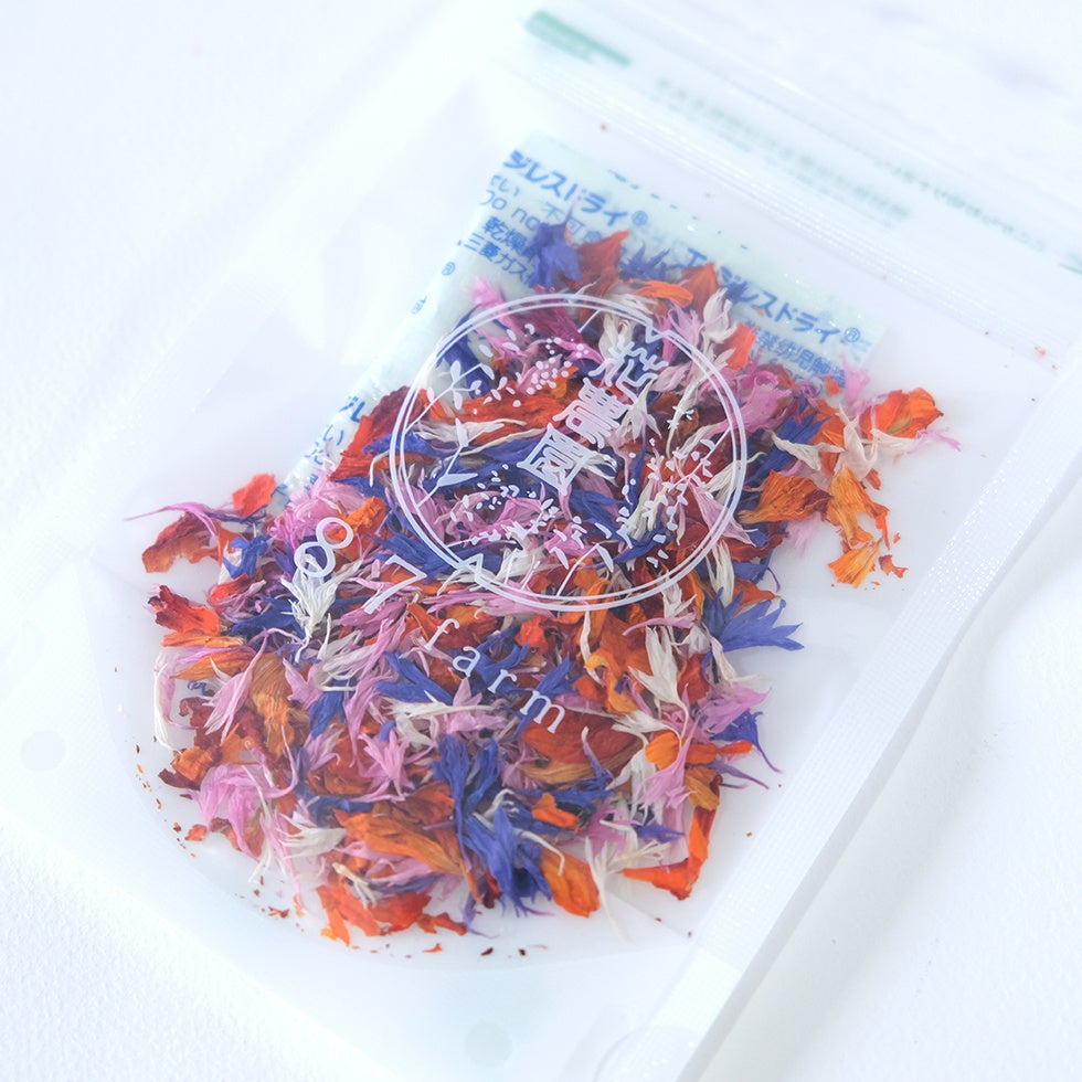 エディブルフラワーとはEdible(食べられる)Flower(花)の文字通り、食用花のことを指します。滋賀県東近江市のエディブルフラワー専門農園87farm(ハナファーム)では化学農薬を使わずに農林水産省のガイドラインに基づいて丁寧に栽培したエディブルフラワー(食用花)を、収穫後すぐに乾燥させることにより色鮮やかで使いやすく保存も効くドライエディブルフラワーにいたしました。