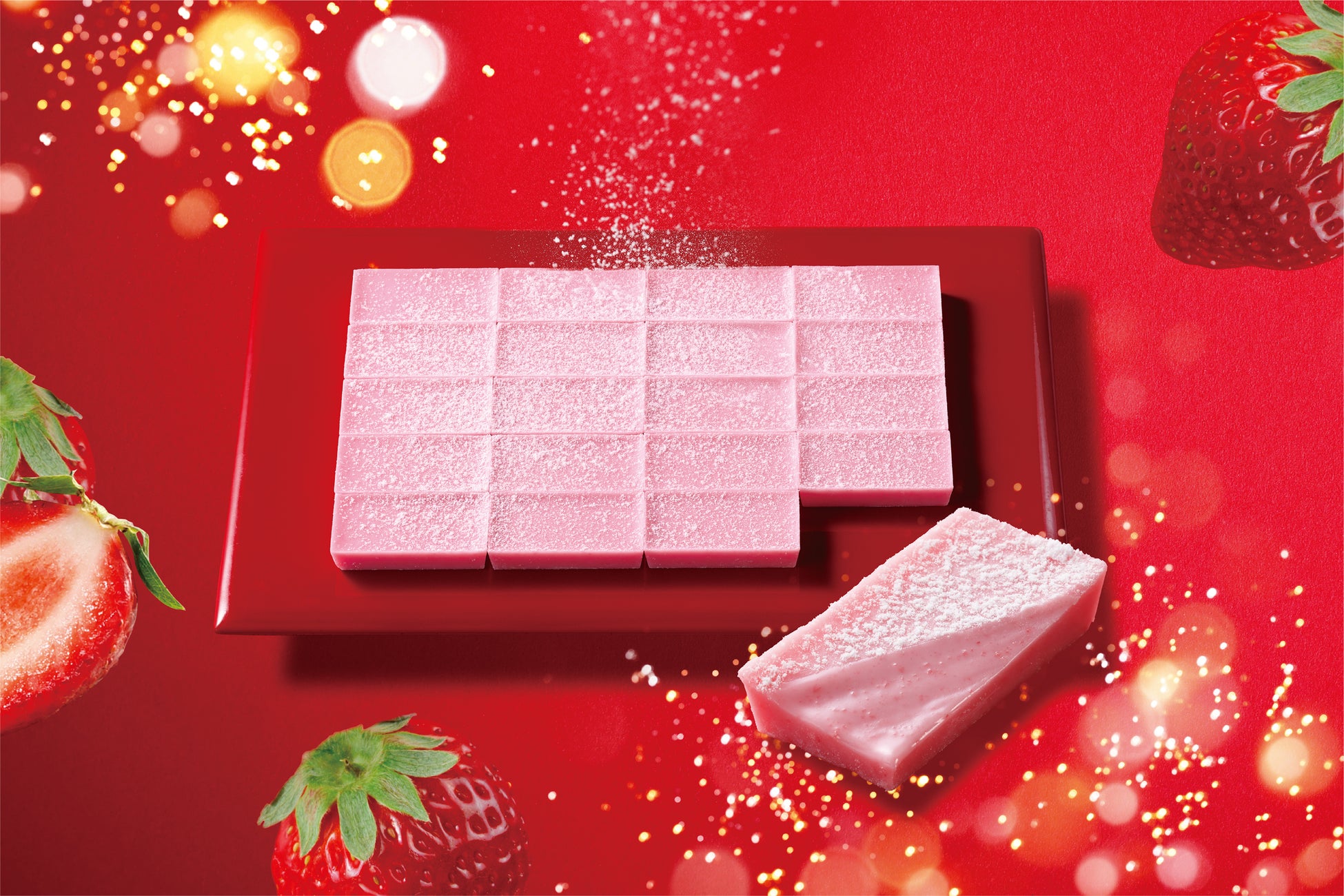 まるで雪化粧のような粉糖を纏った、みずみずしい果実感あふれる、甘酸っぱいあまおう苺チョコレートです。