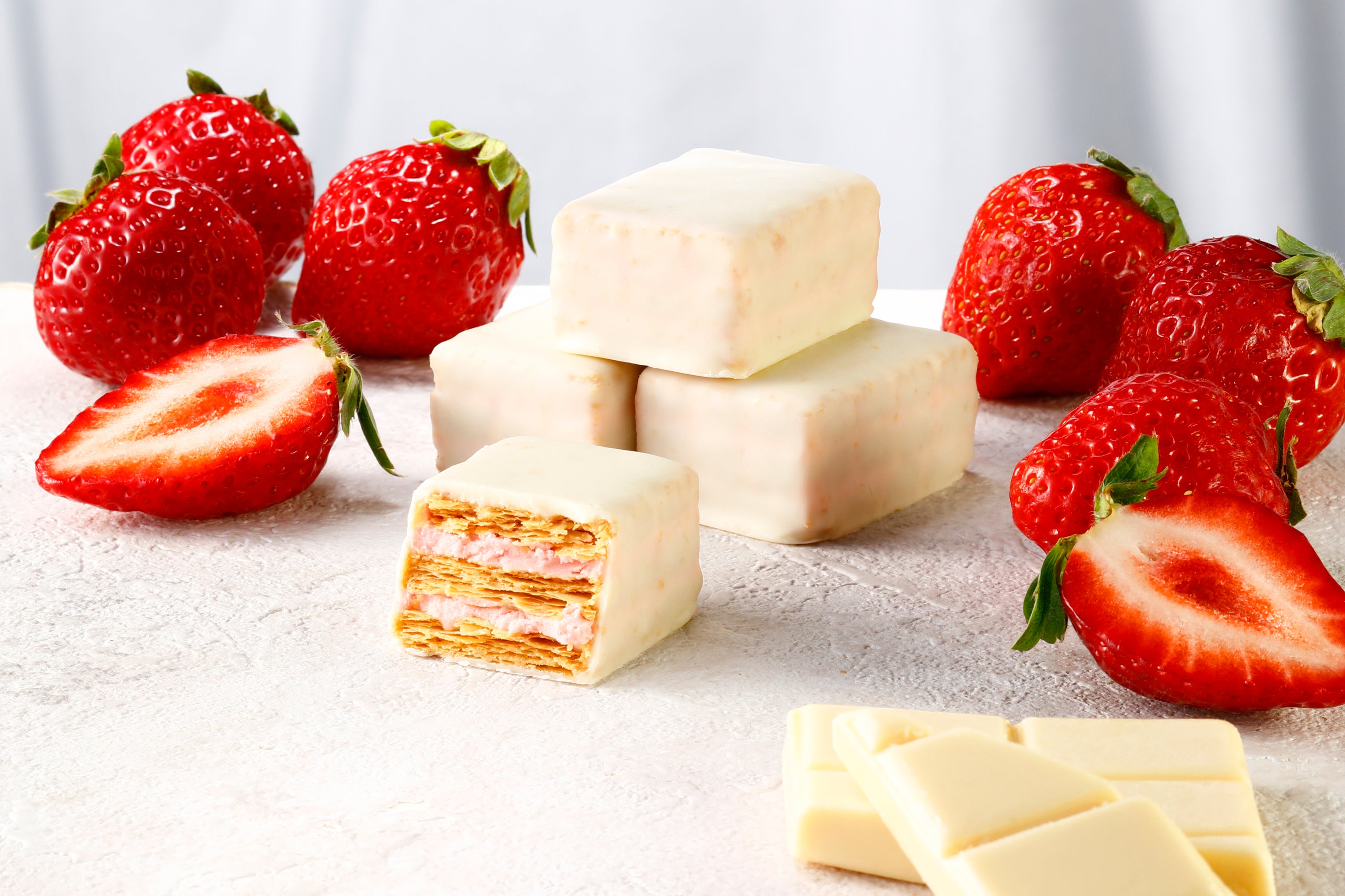 甘酸っぱいあまおう苺クリームをパイでサンドし、ホワイトチョコレートで包み込みました。