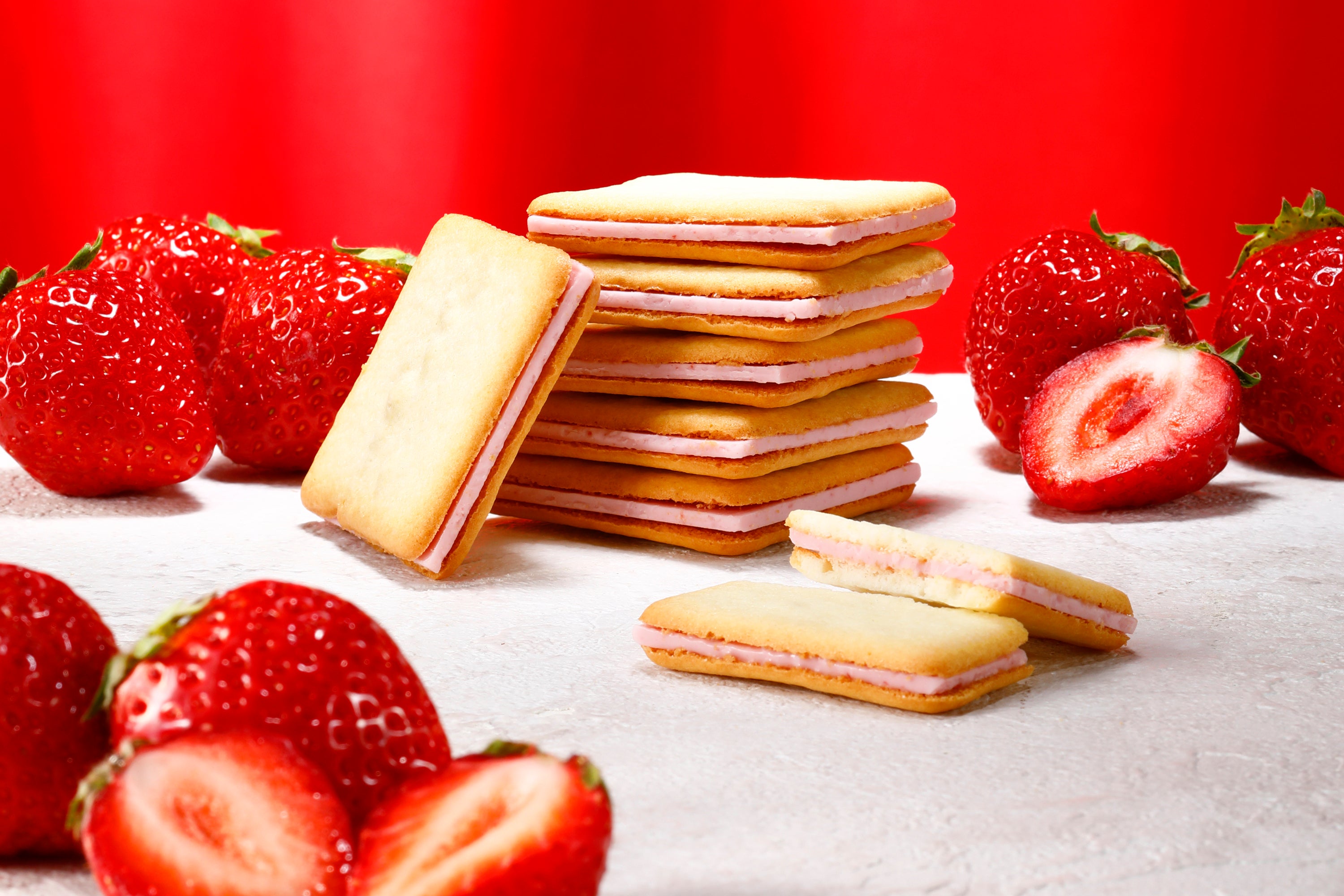 ジューシーで甘酸っぱいあまおう苺チョコレートを、サクサク食感のクッキーでサンドしました。
